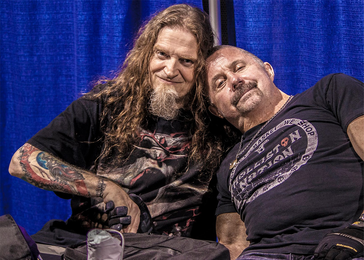 Crypticon creator Chazz DeMoss relaxing with Kane Hodder from the Friday the 13th films.