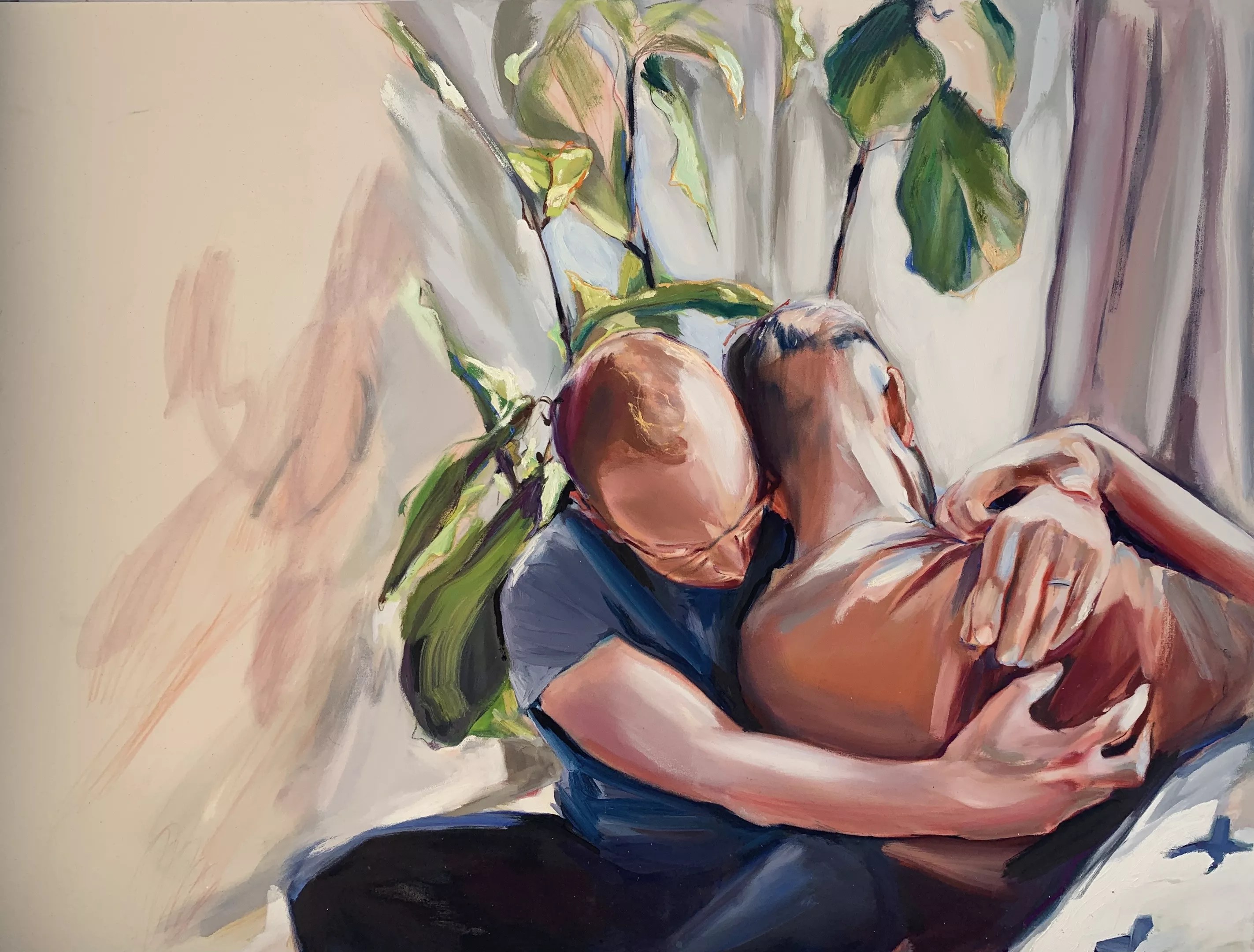 Writing has helped her better understand those connections, and it has inspired some of her paintings. A number of works in The Lilac Hour depict loving gestures between couples, such as “Steven and Jed,” where two men hold and comfort each other, or “Jon and Lisa,” where Jon rests his head on Lisa’s lap.