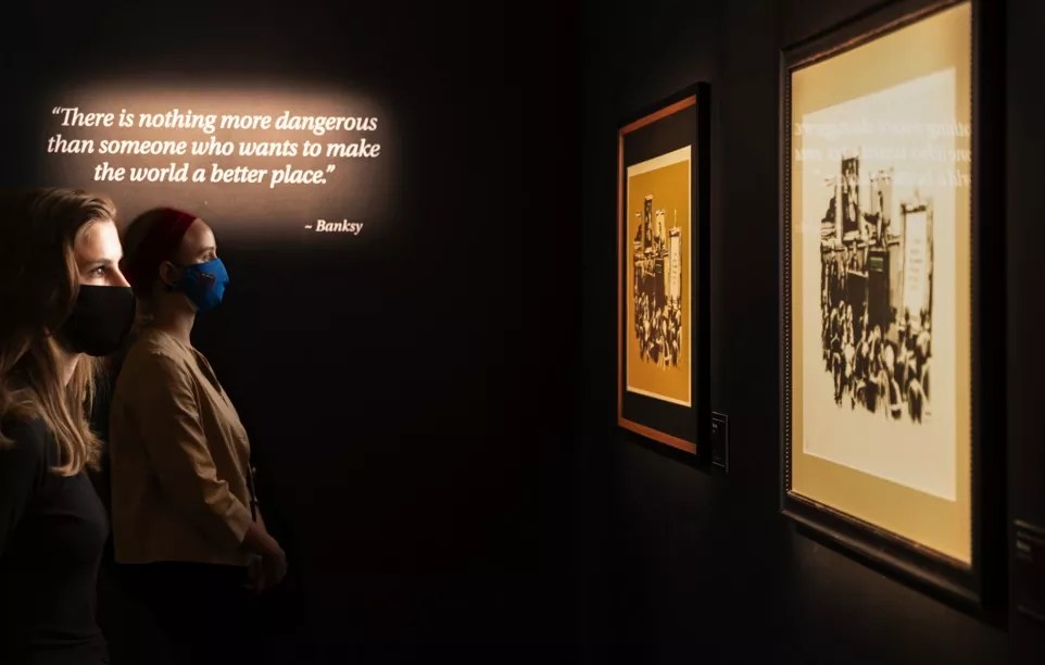 The opportunity to see so many of Banksy’s works is undeniably thrilling, especially considering the mystique surrounding the England-based artist whose actual identity is secret and who specializes in activism and Puckish pranks. In 2018, for example, his “Girl With Balloon” was sold at a Sotheby’s London auction for $1.4 million – and immediately lowered through a shredder. The result, renamed “Love Is in the Bin,” was subsequently sold at Sotheby’s London for a record $18 million.
