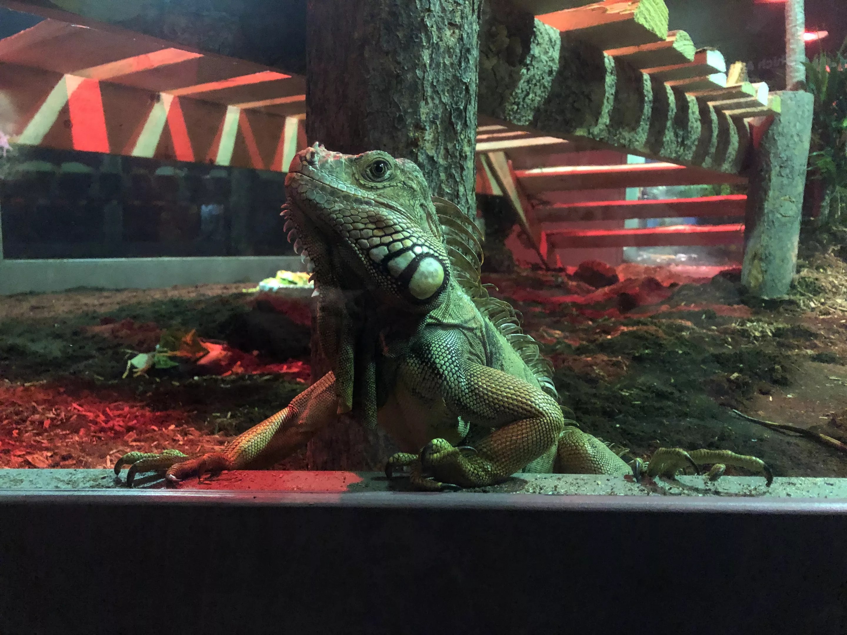 This iguana lives in an area with a turtle and three boas.
