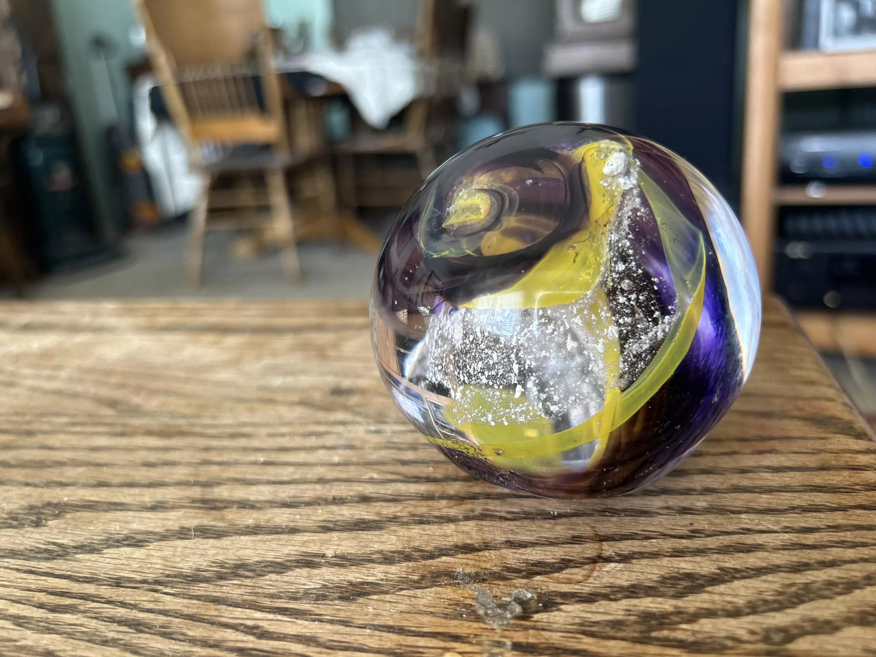 Rains has been making cremation memorials for two years, after learning how to incorporate ashes into glass from her original mentor, Jessica Schimpf of Mantra Glass Art, who has since moved from Colorado. “She was the one who taught me how to do it,” Rains says. “It’s a niche thing, and not a ton of glassblowers do it, and she was one of the few in the Denver area at the time when I started who did it a lot.”