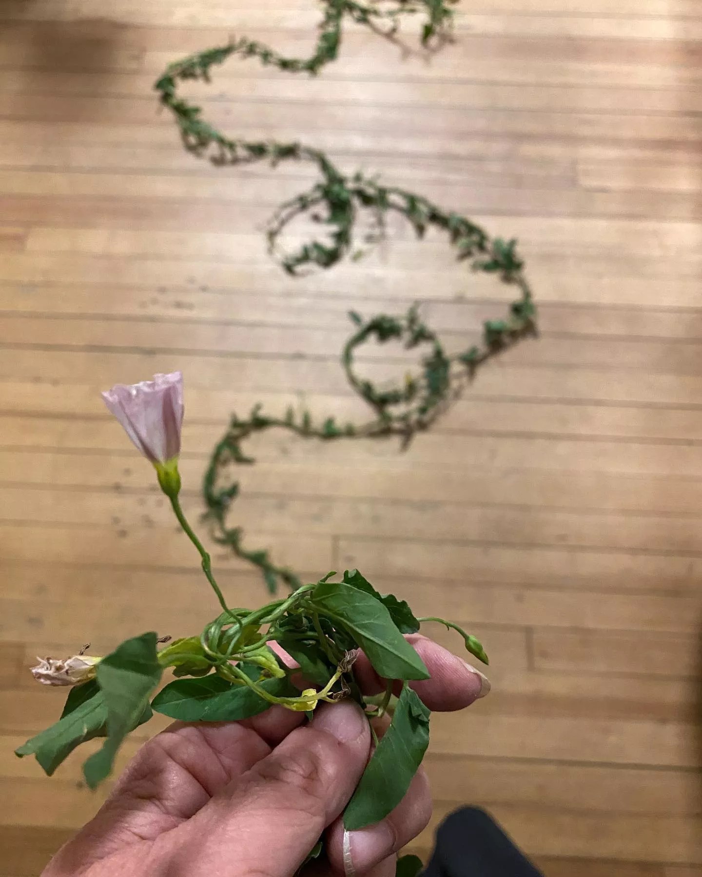 Lauri Lynnxe Murphy, whose practice often collaborates with nature, expands on her studies of convolvulus arvensis (aka bindweed) – one of the most tenacious weeds in the garden – for the installation Entwined in BMoCA’s Present Box lobby display space. You could say she’s celebrating bindweed’s ability to infiltrate our socially correct manicured lawns protected by chemical pesticides and fertilizers as a metaphor for the power of nature taking back its territory. Murphy will continue to add collected vines and plants to the braided living work that hangs in BMoCA’s gallery windows.