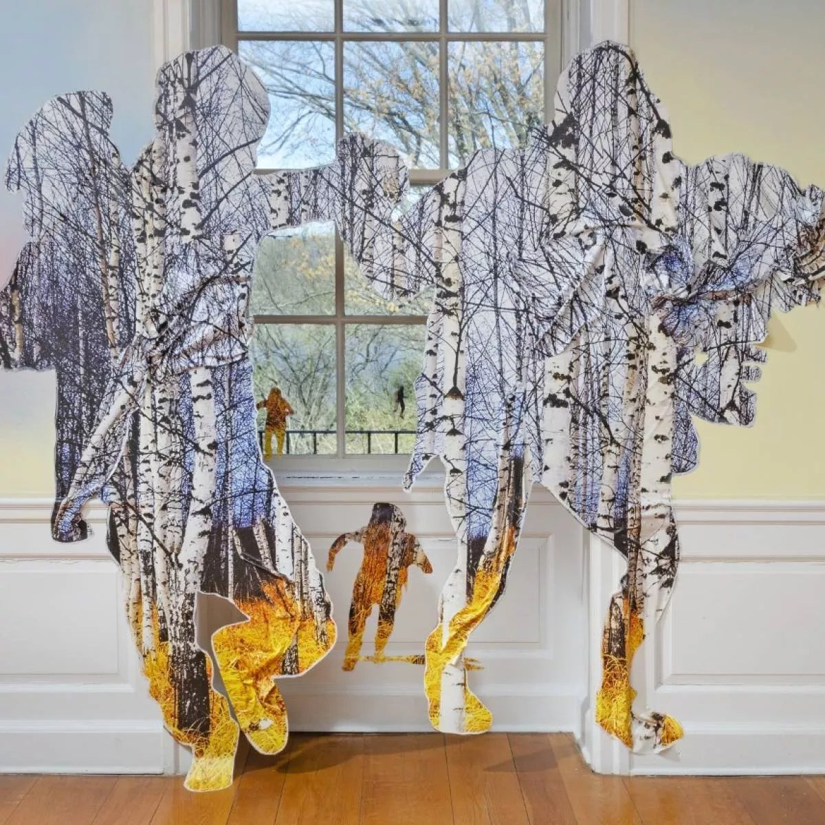 Camille Hoffman, “Las Américas (en el hogar) / Americas (in the hearth), Wave Hill,” 2019, acrylic paint, stock aspen forest vinyl ordered from Amazon, aspen logs, aspen excelsior anti-erosion blanket.