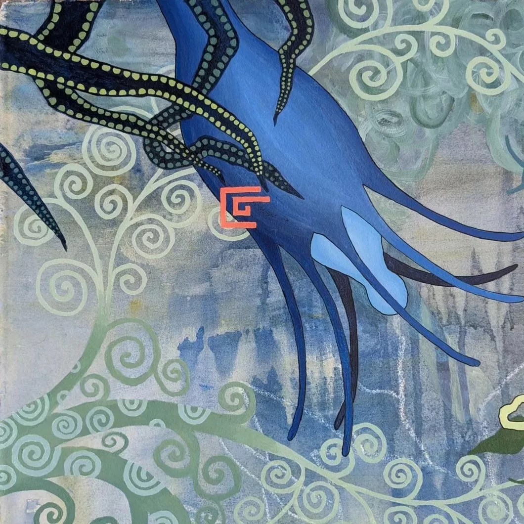 Gail Wagner, “Undaria” (detail), 2023, acrylic, wax resist, paint marker on Arches paper.