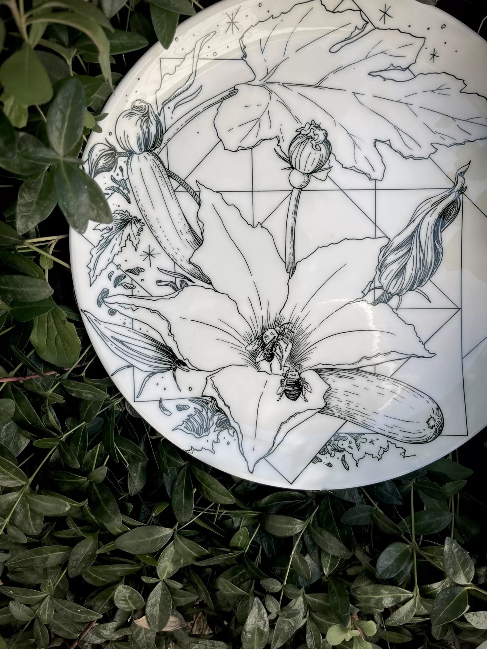Faith Williams, “Squash with Squash bee (Peponapis pruinosa),” original drawing on custom-printed ceramic plate.