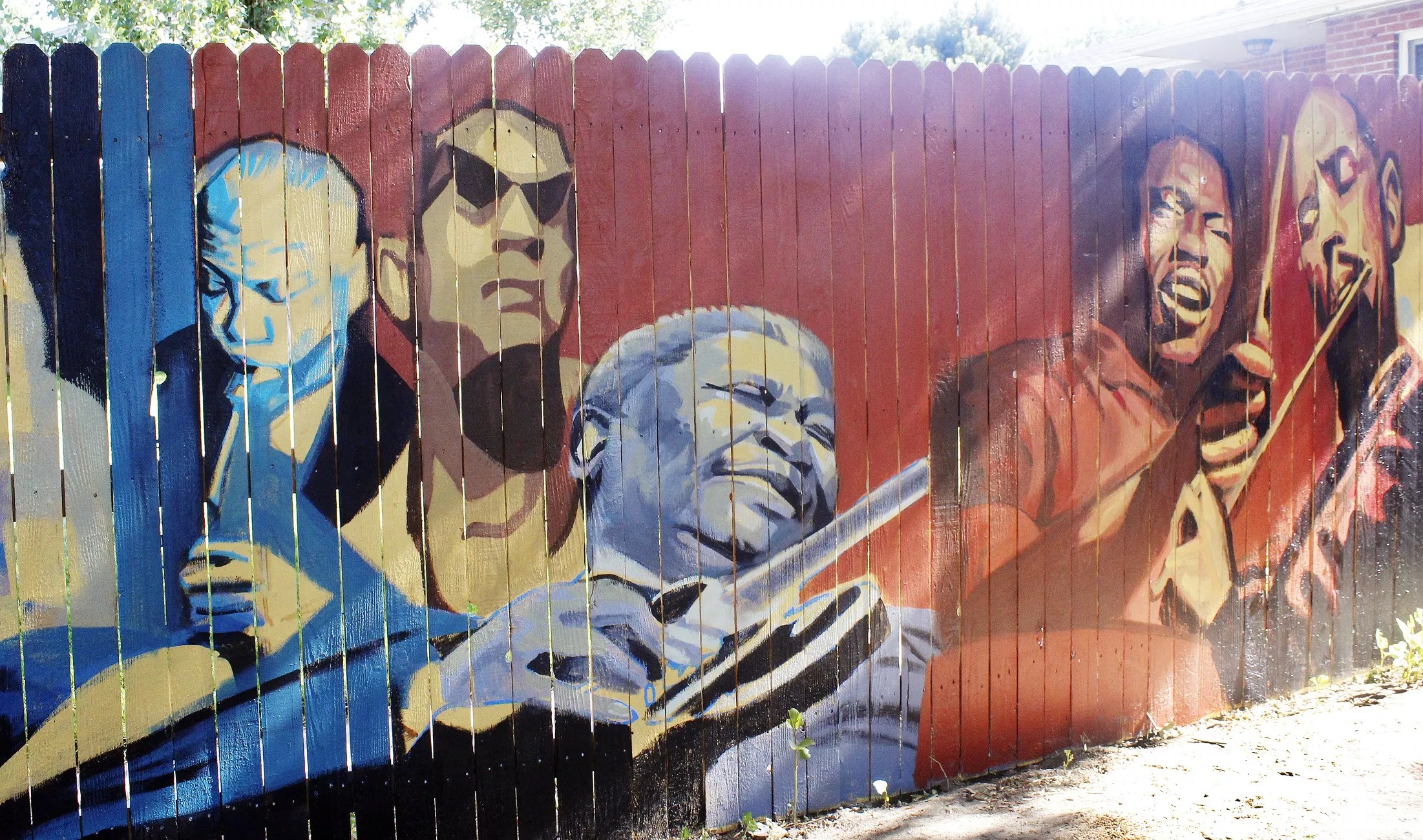 On a cedar fence in Englewood, the blues great B.B. King grooves on Lucille. He is joined on the left by Sidney Bechet and Sonny Rollins – the only living artist depicted on the wall. On the right are drummer Elwin Jones and flutist Eric Dolphy.