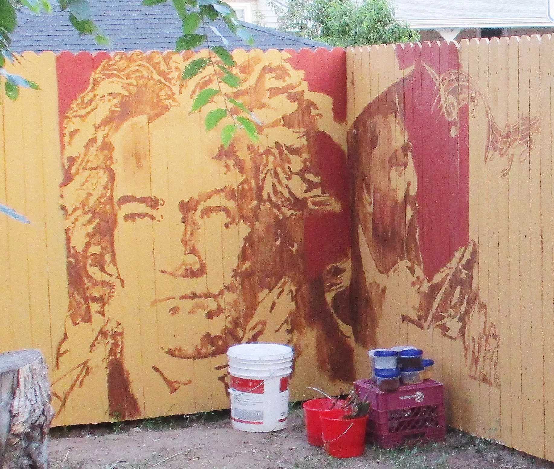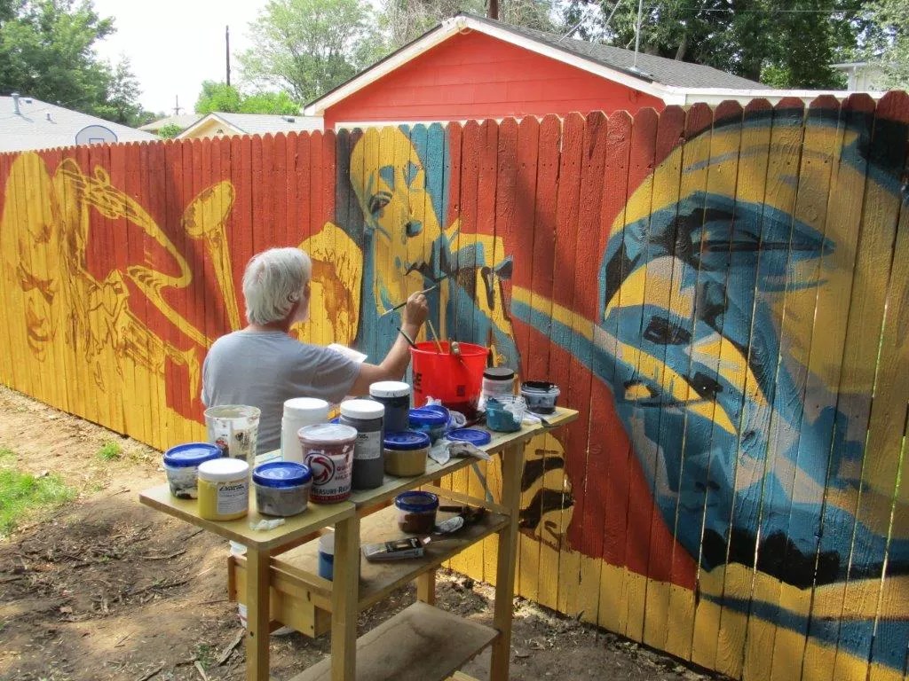 Now the metro area has a Hurley mural of its own – a cool-toned orchestra of acrylic jazz legends obsessively scumbled over a rough cedar fence. Employing Alexis Catala and Izaac Tafoya, two apprentices from his alma mater, and a projector in place of fresco, Hurley is transforming a quiet suburban back yard into a roaring jazz club.