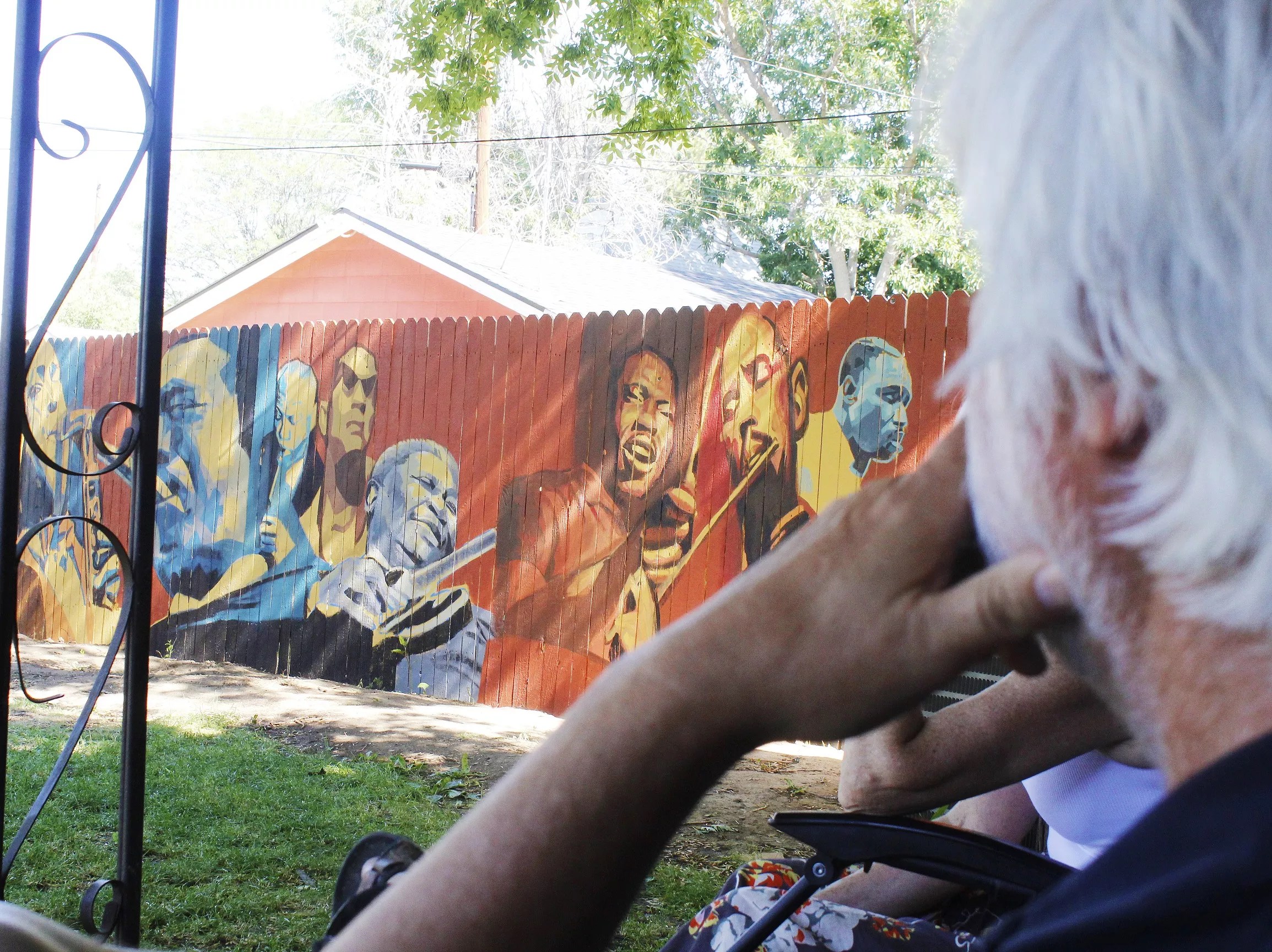 Now the metro area has a Hurley mural of its own – a cool-toned orchestra of acrylic jazz legends obsessively scumbled over a rough cedar fence. Employing Alexis Catala and Izaac Tafoya, two apprentices from his alma mater, and a projector in place of fresco, Hurley is transforming a quiet suburban back yard into a roaring jazz club.