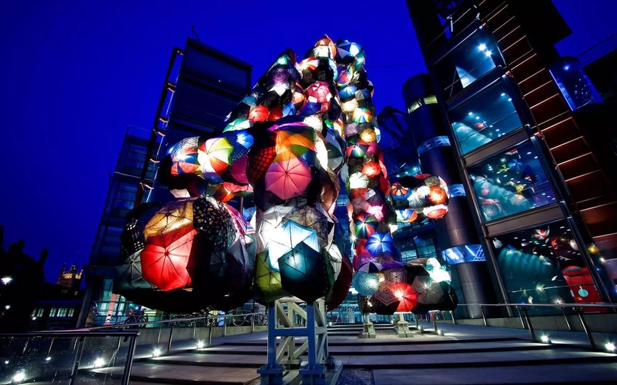 The artist has been creating site-specific umbrella installations all over the world since 2009, when, fresh out of grad school, she answered a call from London’s Channel Four Television Corporation, which annually commissions one artist to transform the station’s iconic “Big 4” sculpture into a singular work of art.