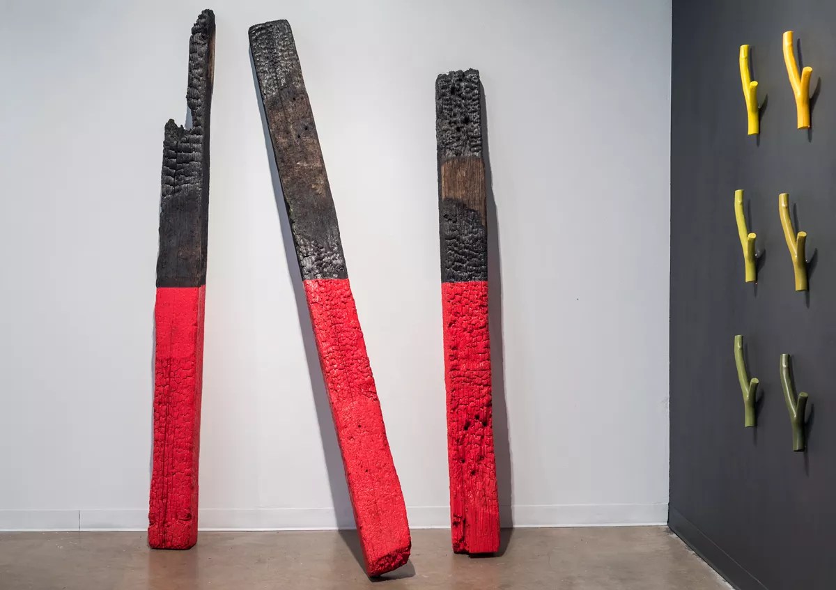 The tour de force here is a wall of 100 cast gypsum elements in the shape of evenly spaced, conventionalized Y-shaped twigs. These twig-inspired elements have been colored in a spectrum of shades that gradually goes from hot tints on the left to cool ones on the right. The perfect counterpoint to this elegant wall is a grouping of three found timber beams off to the side that are scorched black at the top and painted fire-engine-red on the bottoms.