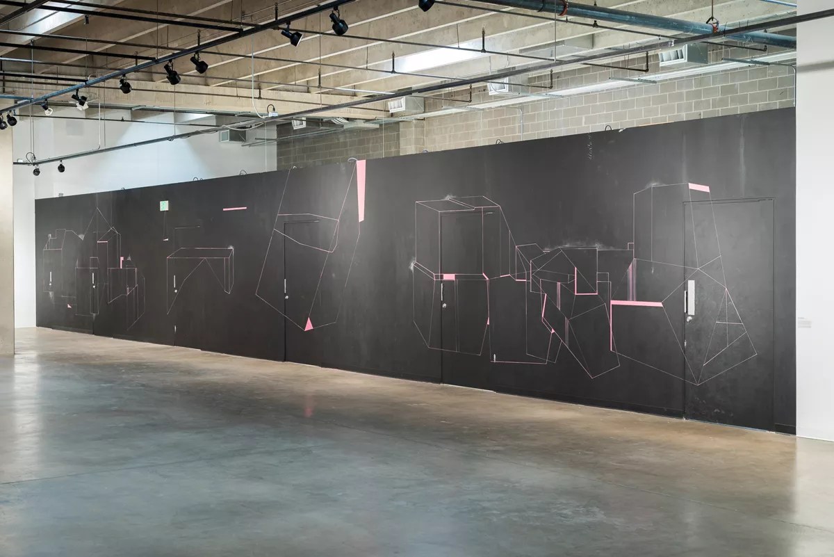 Occupying a huge footprint in the center of the space is Andrew Huffman’s “Meandering paths triumph over -isms,” a two-part installation whose halves are each in the shape of a circular scoop. Huffman has appropriated the gallery’s four movable walls and used them as anchors for evenly spaced courses of rainbow-painted yarn that’s stretched between them. Defining spaces with stretched yarn or string was first done by the late Fred Sandback in the ’60s and ’70s, but in the last few years, similar ideas have grown into a full-fledged international movement, and Huffman is its chief practitioner here in Colorado. On the west wall, where there are doors to some of RedLine’s studios, is Bonilla’s “Heliocentric Distance (CERCA)”; he’s painted the extremely long wall black with architectonic lines in a pinkish shade that look like perspective drawings of buildings. Although Bonilla wanted to use this wall in such a way that the piece would work whether or not the studio doors were closed, when they are open it definitely suffers.