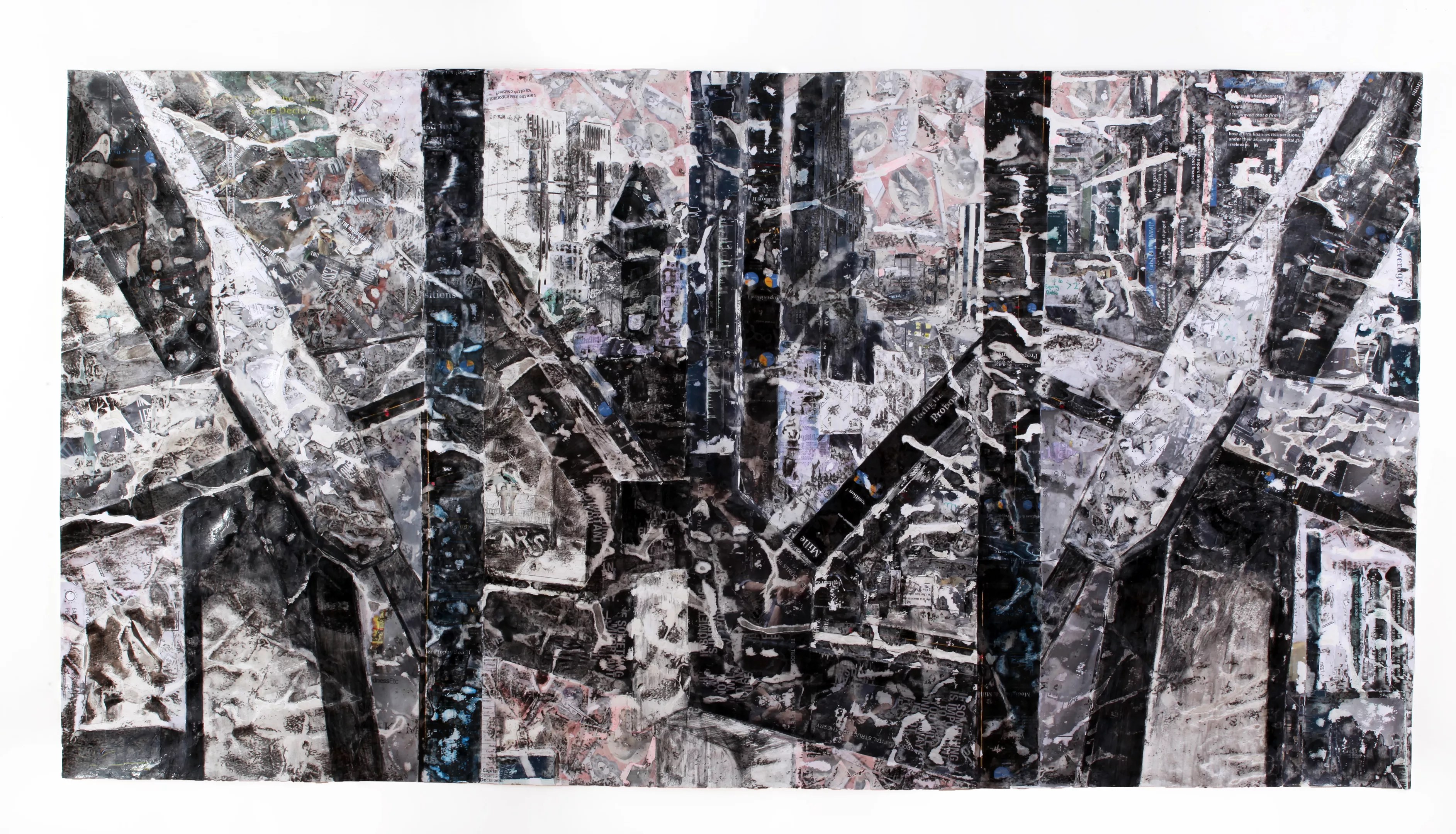 Margaret Lawless also messes with photos and uses them as the basis for her pieces, but she does something completely different. Instead of looking for anonymous amateur photos like Patton does to serve as source materials, Lawless aims higher, using the famous photos of New York taken by Berenice Abbott in the 1930s when she was working for the Federal Art Project of the WPA. Lawless translates the Abbott imagery into layered paintings that incorporate collage.