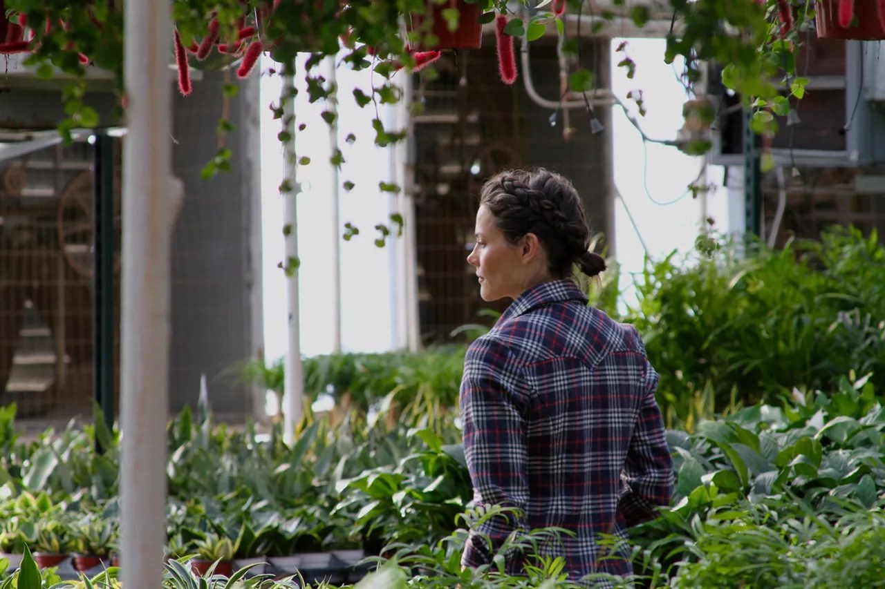 Kristin Schuch contemplating aisles of plants inside the Calabrese Greenhouse.