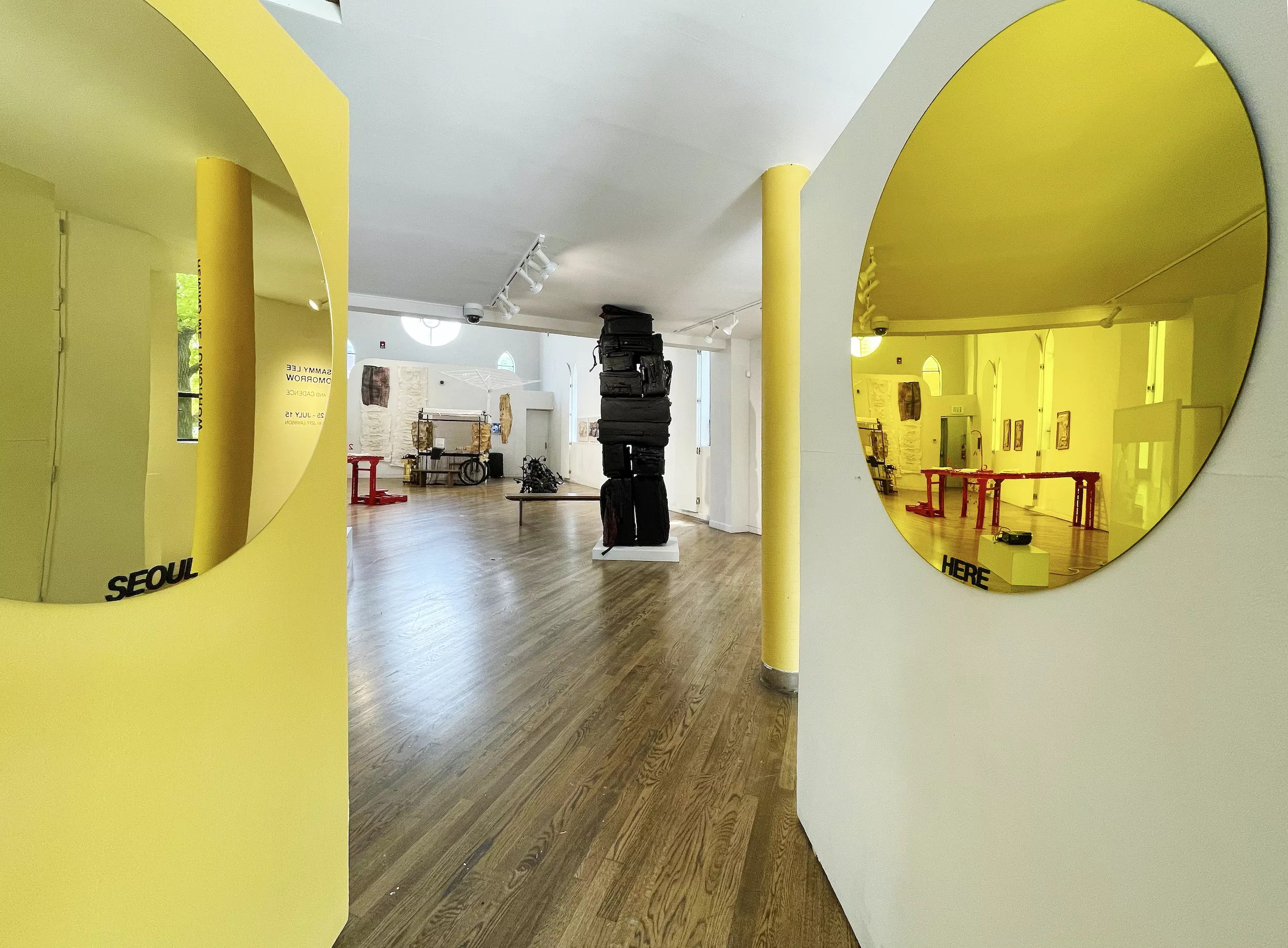 “These interventions will ready your mind for the infinite reflections of the yellow-person mirrors,” Lee continues, stepping inside. Lee points the way to a narrow space where two yellow-and-gold-tinted mirrors face one another, showing white viewers what it might look like to have yellow skin as they register their own inner reactions, which are sometimes not so positive.