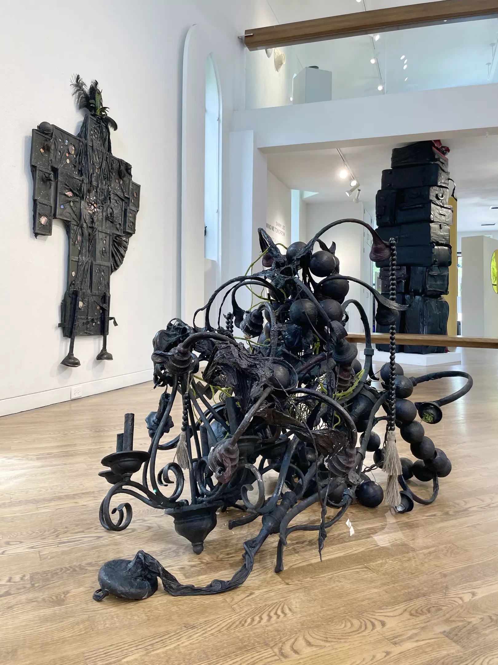 In other works, Lee mines her background in the study of architecture and furniture design for another angle. The sculpture “Chandeliers,” a black tangle of chandelier parts piled with dry moss and decorated with silk flowers, ribbons and beads, represents another side of domesticity. “Chandeliers are the antithesis to robots,” she says. “I think of them as shining above the table at a perfect dinner party,” reflecting a more evolved vision of femininity.