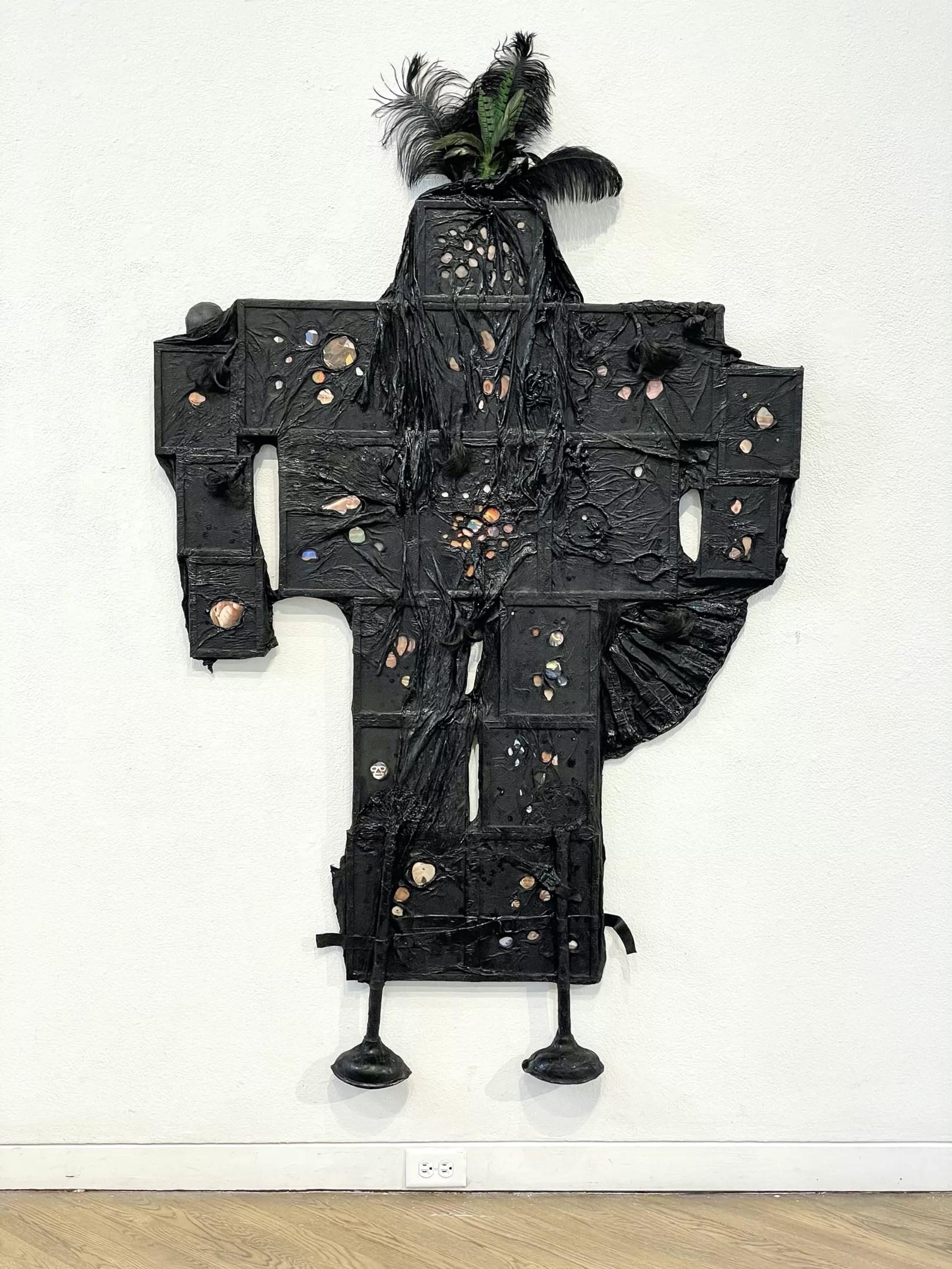 The super-heroic “Mamabot,” festooned with embedded family photographs, plastic toys and other symbols of child-rearing, represents how the artist, caring for the home while parenting small children, sometimes needs to turn on a dark and funny robotic separation from dull reality, even as tears fall from her eyes.