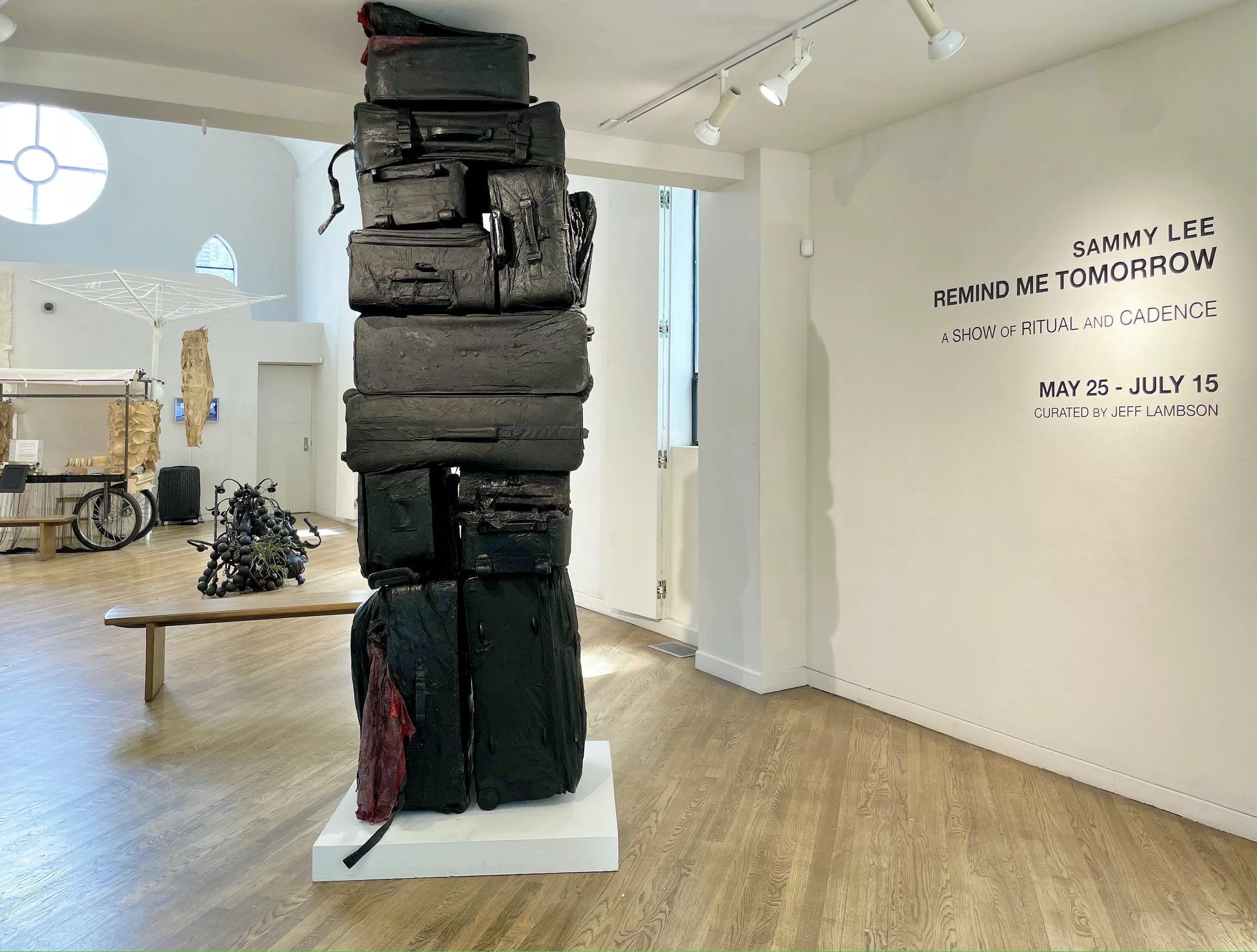 Beyond the disorientation of the infinite mirrors, a ceiling-high stack of bulging, ragged luggage wrapped in a skin of black paper looms like a fragile Tower of Pisa, leading people into a contemplation on the immigrant experience.