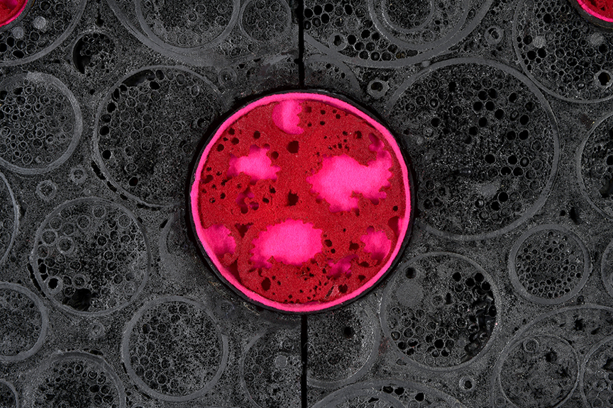 Much of the act of creation in Maker’s work tends to embrace tearing apart before the reconstruction. “I put my materials through extreme force, such as pressure, cutting, drilling, grinding, and shredding,” she explains. “Then I arrange the matter into abstract composition that hints at space, or the cosmos. In other words, I bury things, and then I kind of resurrect them.”