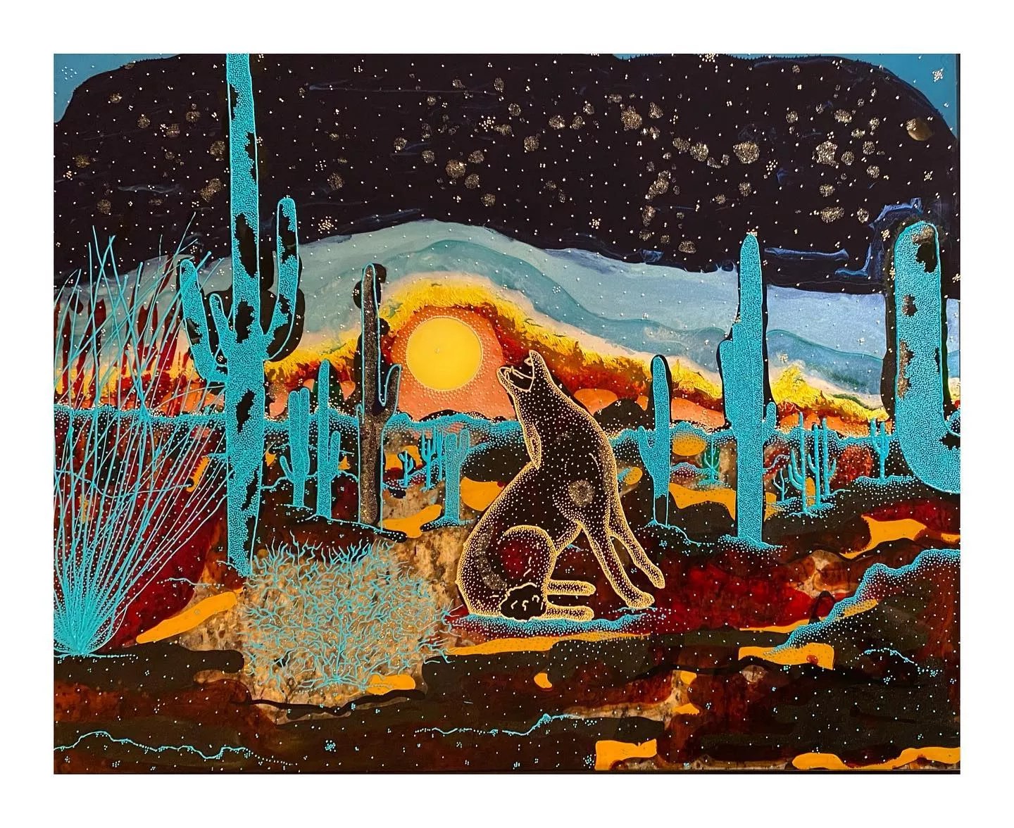 A glass painting of a Southwestern scene by Suzanne Savoy.