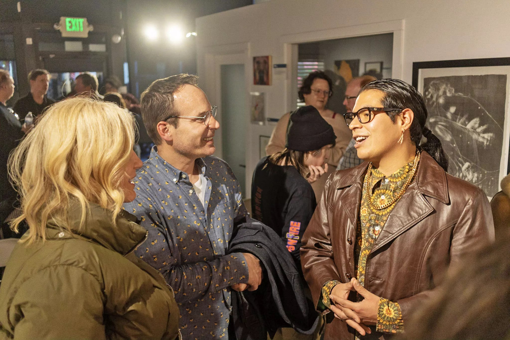 Hip-hop artist Dime Dee talking with gallery regulars Julie and Ryan Smith.