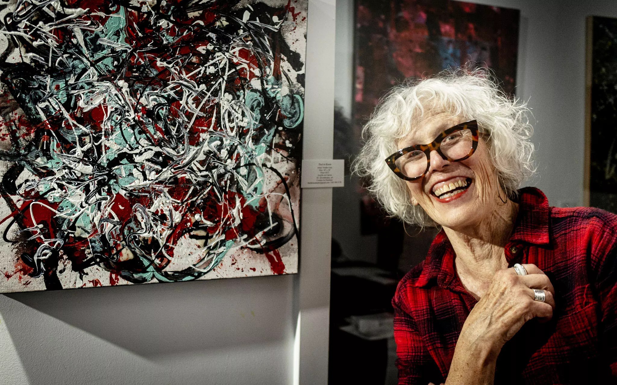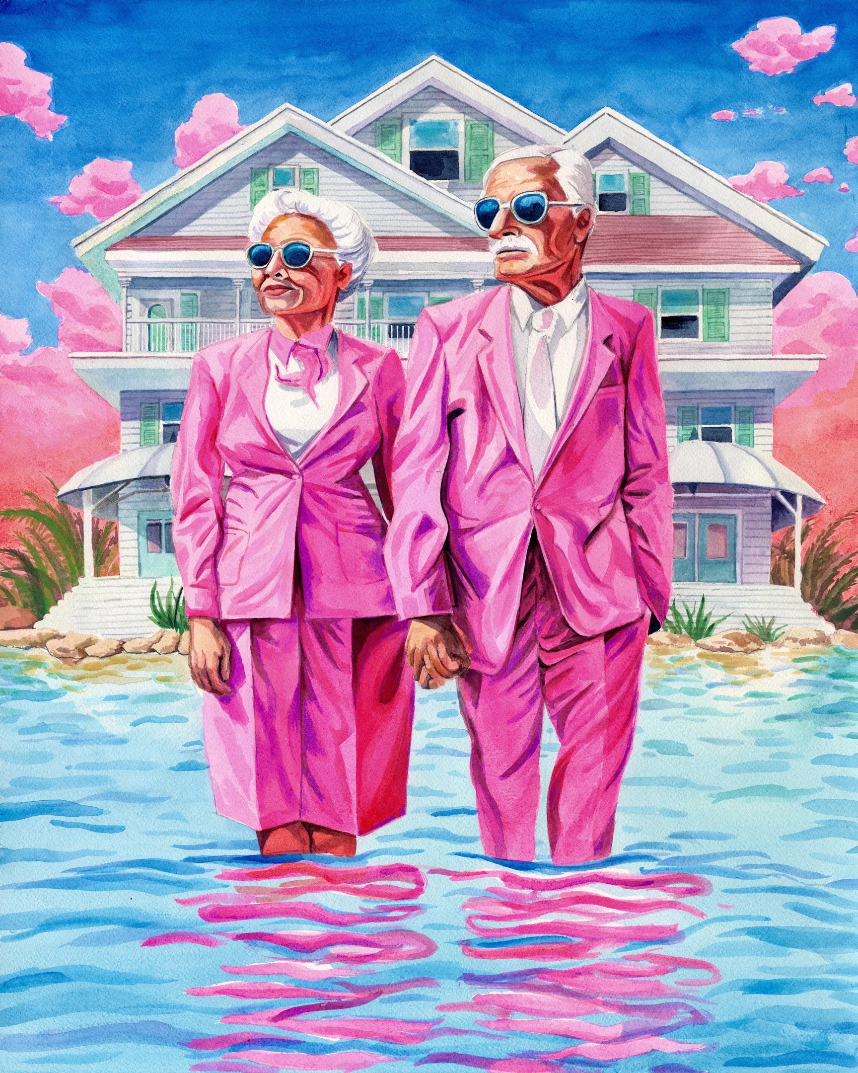 “Carrie Shiffrin’s ‘Snowbirds’ also made me laugh,” Gray continues, referring to a vibrant, dreamlike watercolor depicting an elderly couple wearing matching pink suits and standing knee-deep in water in front of their McMansion. “Shiffrin’s skill is unmistakable in the color, subject and expression on those faces. … Again, the humor of the piece allows us to look into its depths and wonder at the human spirit.”