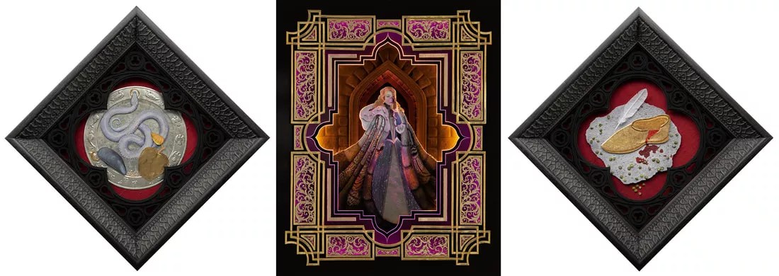 Nicole Grosjean, “Grimm Still Life: Cinderella,” cut paper, silk, 24k gold leaf, watercolor and gouache and “Thousandfurs,”cut paper, 24k gold and 13k white gold leaf, watercolor, gouache and led lights.