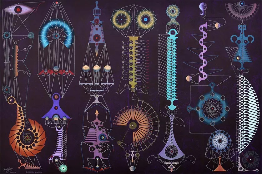 Cuban artist Carlos Estévez has been granted plenty of main-gallery space at Havu for twenty phantasmagoric canvases rendered precisely in oil and watercolor pencil, both large and small in size. Each work is its own cabinet of curiosities, holding shapes informed by delicate machinery, mandalas, electronic boards, semiotic language and forms from nature. For balance, painter Homare Ikeda has a group of small expressionistic works on the Mezzanine that burst with color and lively shapes.