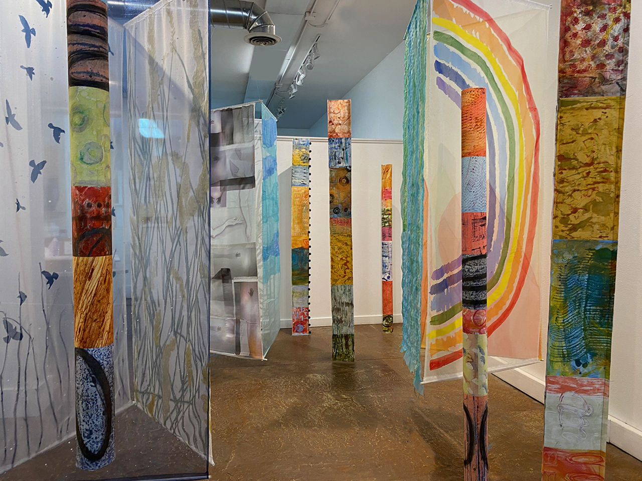 A painter at heart, Madeleine Dodge has no problem mixing up media in her abstract compositions. Her latest collection, Lost Objects: An Anthology of Blue, is inspired by poems in solemn shades of blue, while fellow Spark member Kathryn Oberdorfer’s abstract paintings riff on people finding their way back from long-term COVID isolation. In the North Gallery, Patricia Miller uses photomontage and digital painting to comment on humans’ impact on nature.