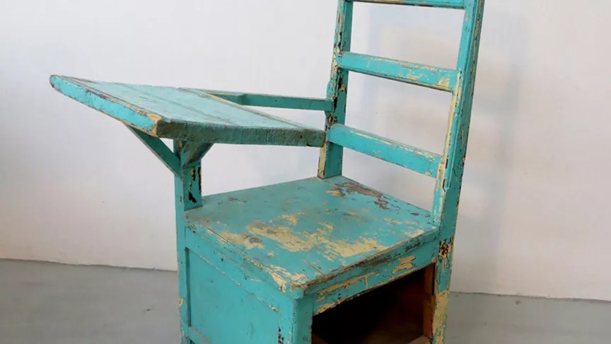 Seat of Learning all began with a vintage chair – the kind that once served as a student desk in the classroom over an unknown number of years. Artists Jane Lackey and Thomas Lehn, who saw it as a relic from the twentieth century and an unbeatable story trove, gathered similar object and tales, then worked with students at the University of Colorado Colorado Springs to create an installation from their findings.