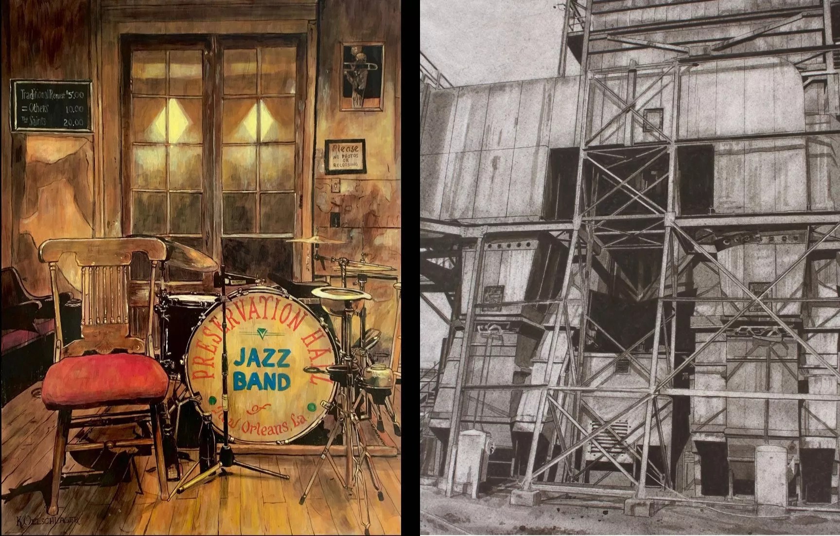 Josh Davy and Keith Oelschlager offer opposing views of the urban landscape for Slowly Fades Away. While Davy captures industrial buildings in decline in muted black and white, Oelschlager paints city street scenes and rural reveries, rendered under an aura of nostalgia.