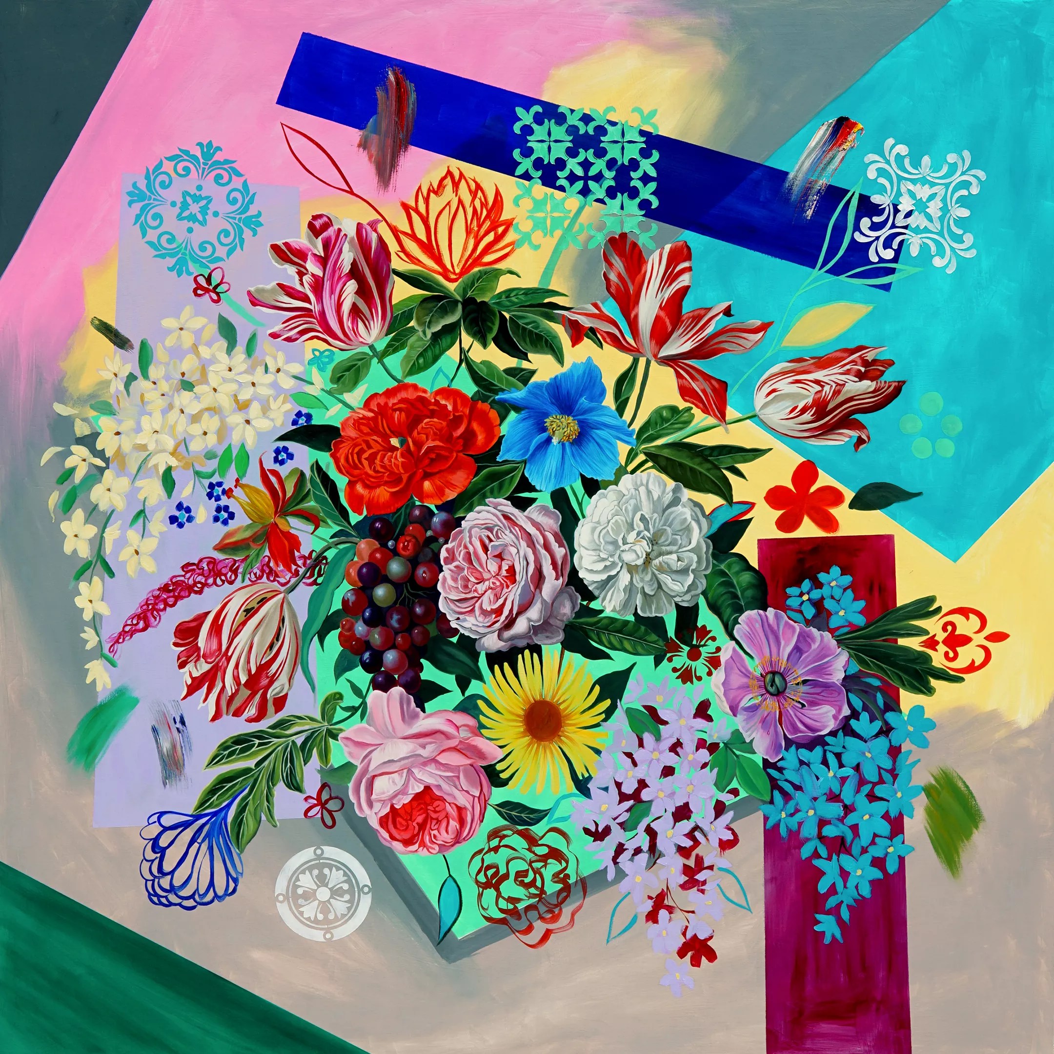 Robin Hextrum, “Dance of Geometry with Petals,” 2021, oil on panel.