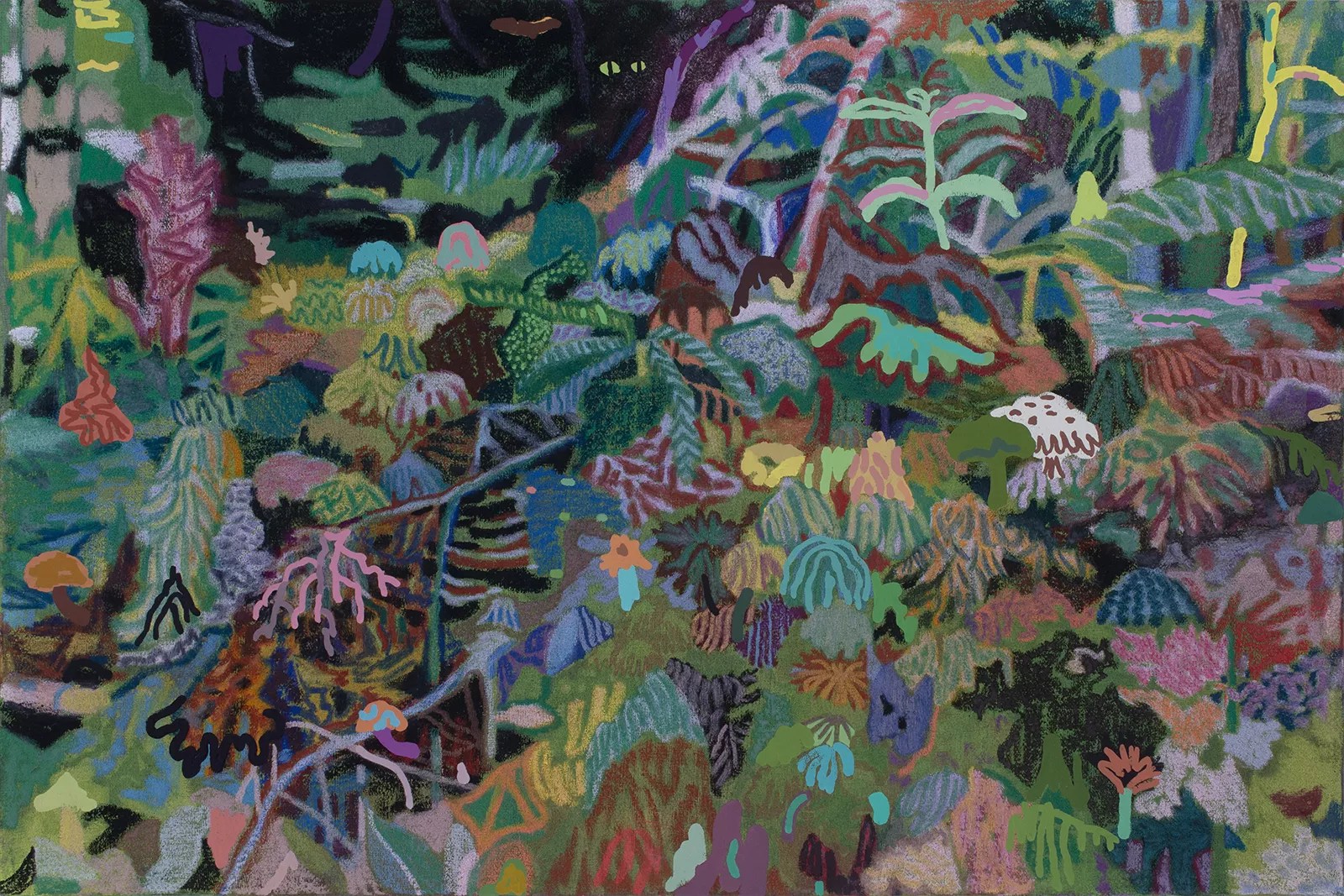 Leon Benn, “Sleepy Forest,” oil and fabric dye on linen.