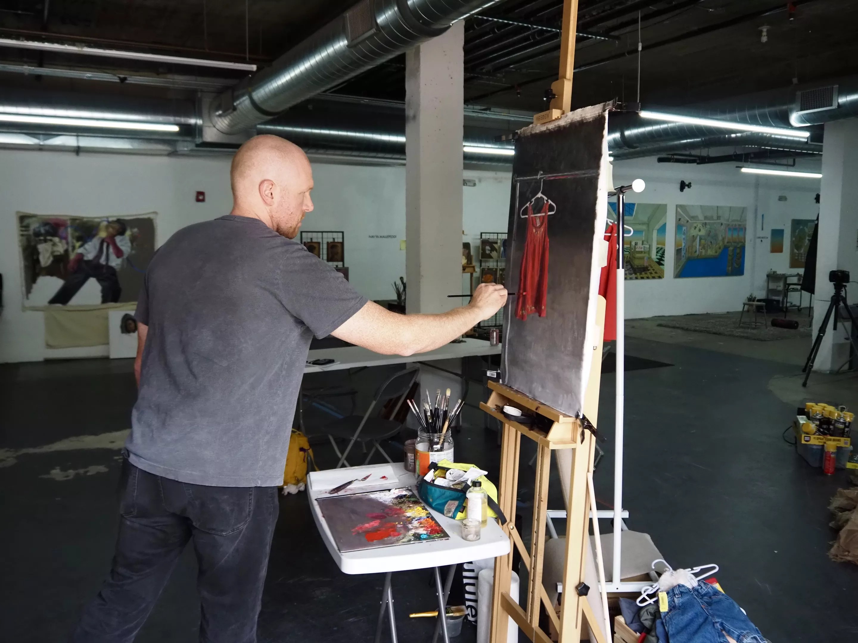 McCall paints from life, setting up portraits or still life scenes with items that catch his attention while wandering around Arc. Last week, he was working by the light of the storefront’s garage window on a painting of an infant dress. “I had the idea of it hanging by itself on a stand and thought that would be really poignant to have the contrast of a cute, adorable little dress in a very lonely setting,” he says.