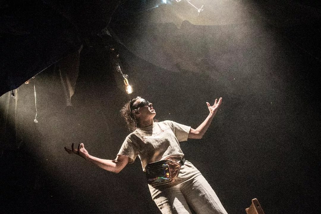 The setting is evocative: a large, bare space surrounded by chairs, which we’re exhorted not to move. Seated in a large circle, we can watch the audience members opposite us as they view the action; some cast members are seated among us. Colorful fabrics hang from the ceiling, along with various props. Nine actors play all of the roles, some of them interchangeably night by night and picked by chance, so that almost every performer will have to memorize the entire script and each performance will have unique nuances. Director Julie Rada’s interpretation, like the author’s intention, is clear: We are all Everybody, and every one of us will die.