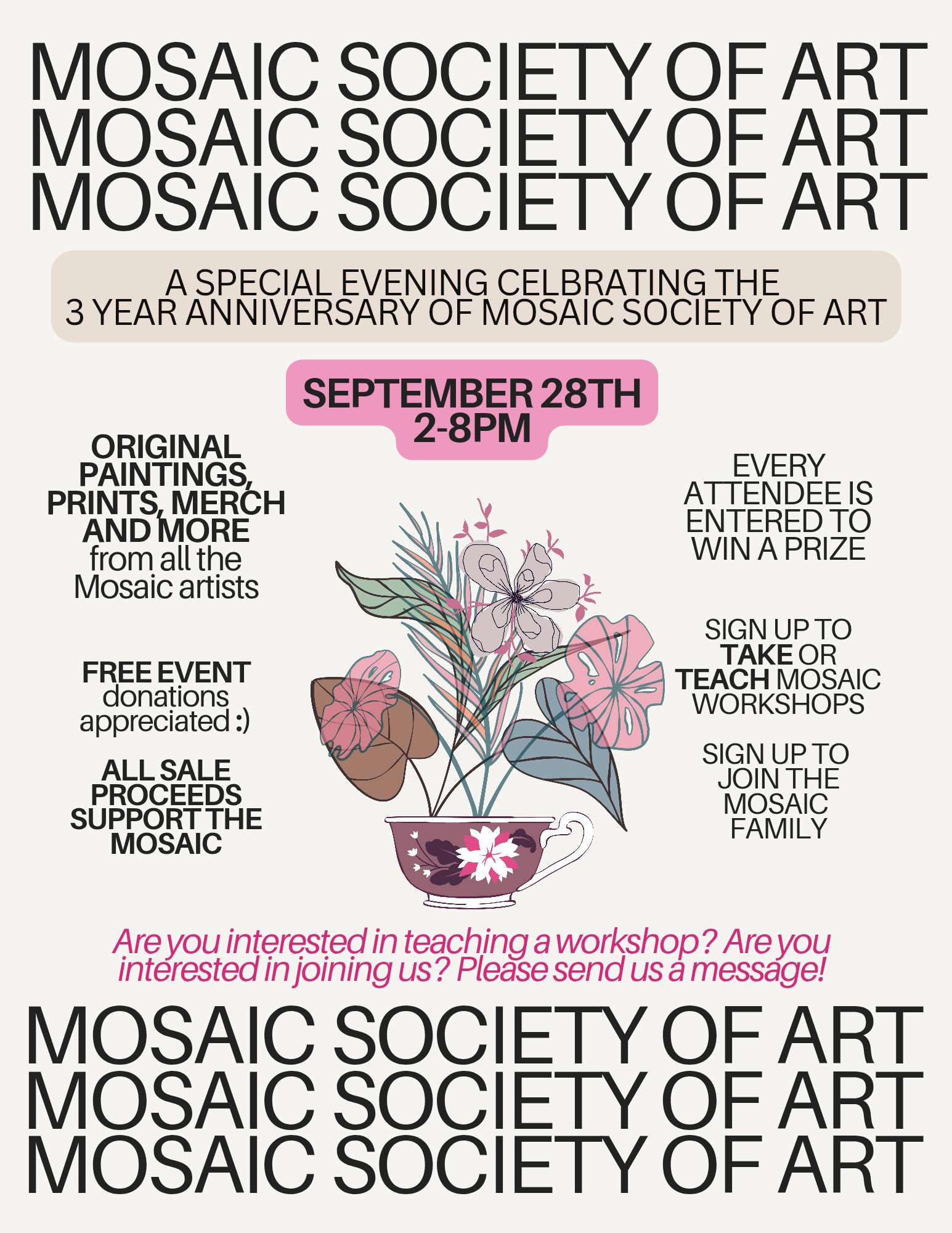 The Mosaic Anniversary Gallery Show is 2-8 p.m. on Sunday, September 28, at Mosaic Society of Art, 1960 South Bannock Street. The event is free. Follow Mosaic on Instagram @themosaic.art.