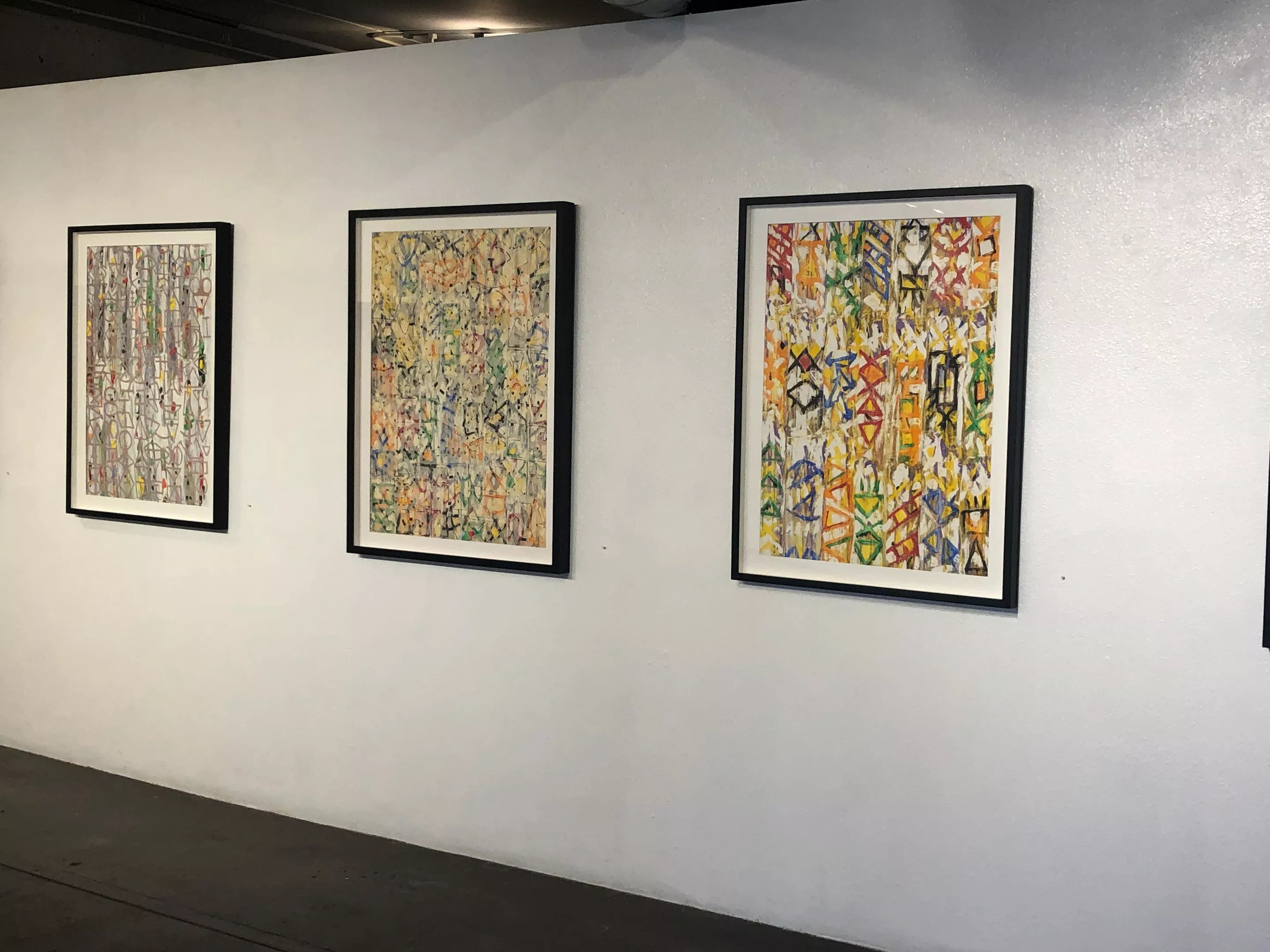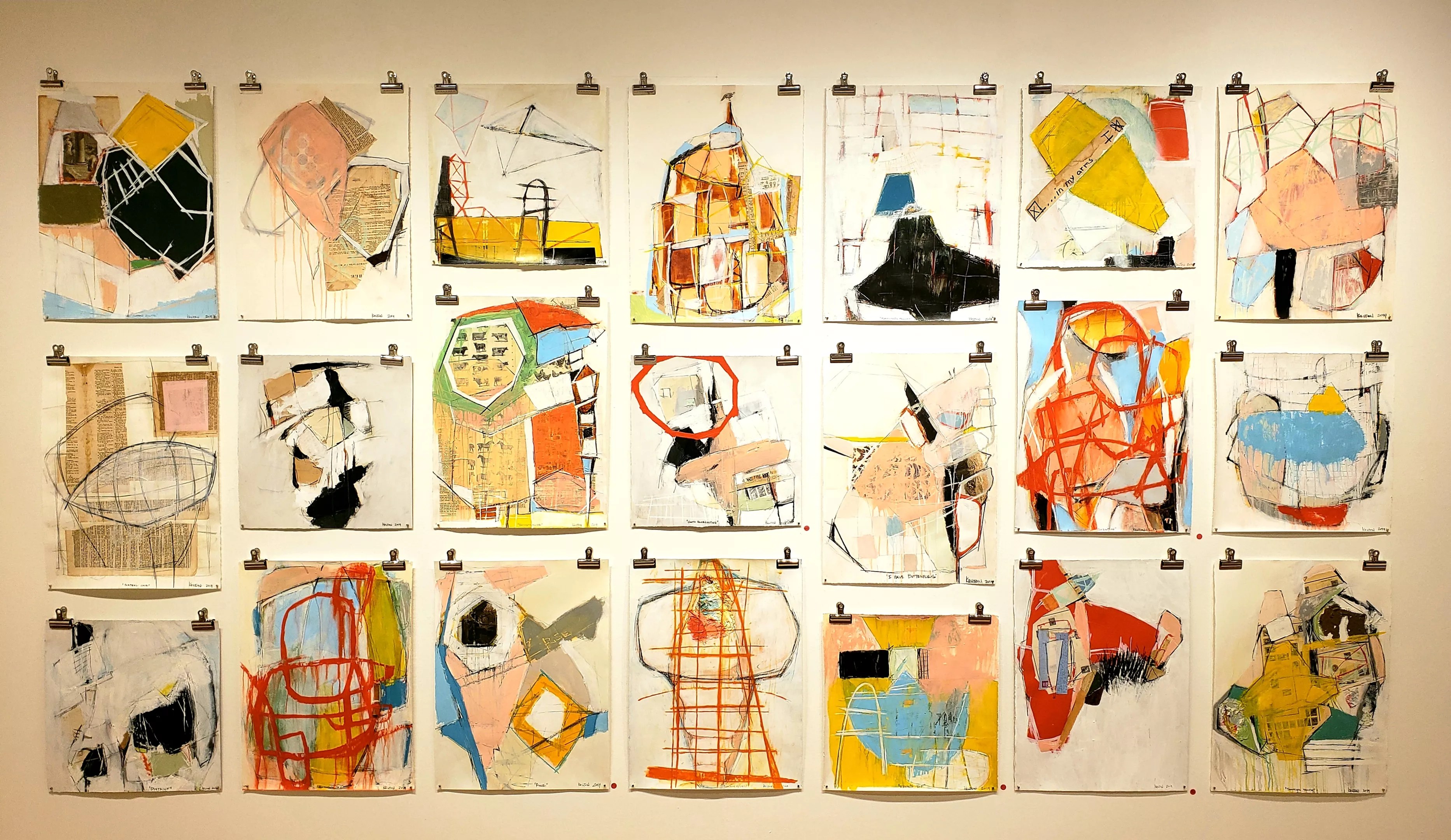 An installation of Kelton Osborn’s mixed-media paintings on paper.