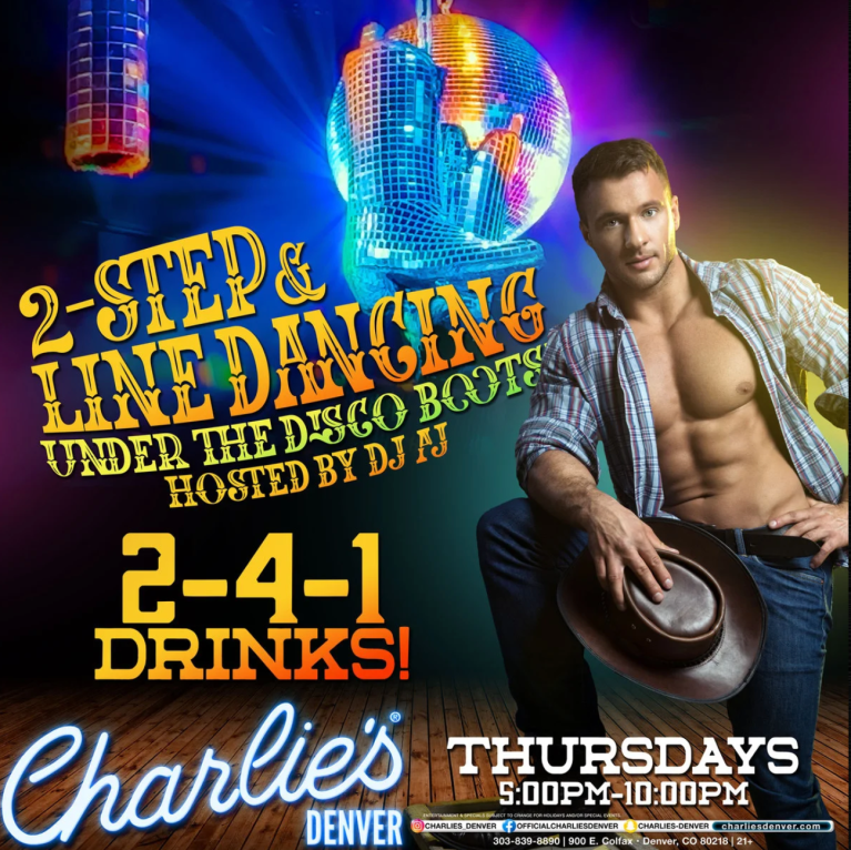 2-Step & Line Dancing: Under the Disco Boots When: Every Thursday, 5:00 PM Where: Charlie’s Denver Tickets: TBA | Get Tickets Hosted by DJ AJ advertisement