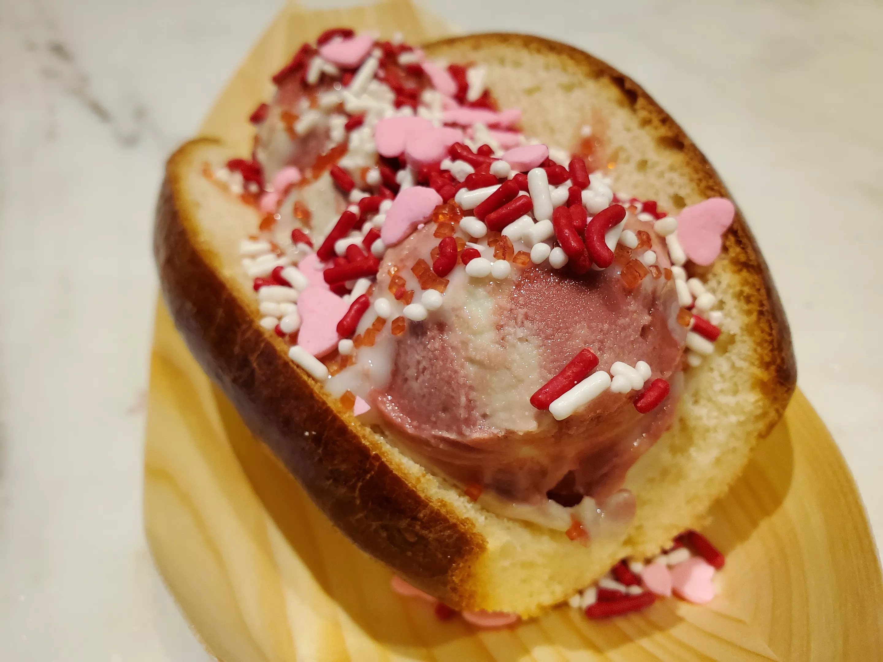 “We wanted something different and fun and creative outside the normal dessert realm,” he explains while adding heart-shaped sprinkles onto the signature Thai bun creation. “This is our geeked-out version.”