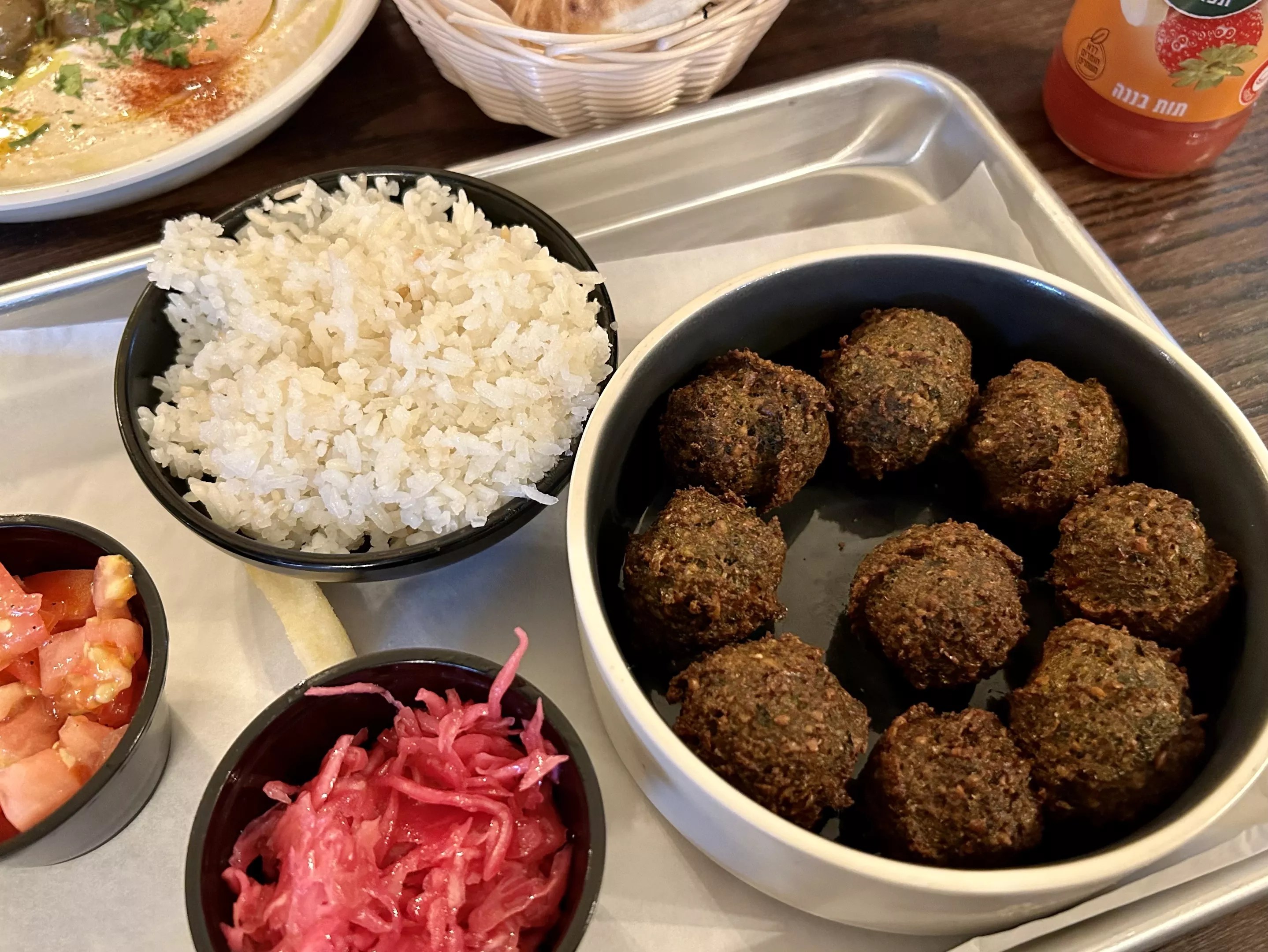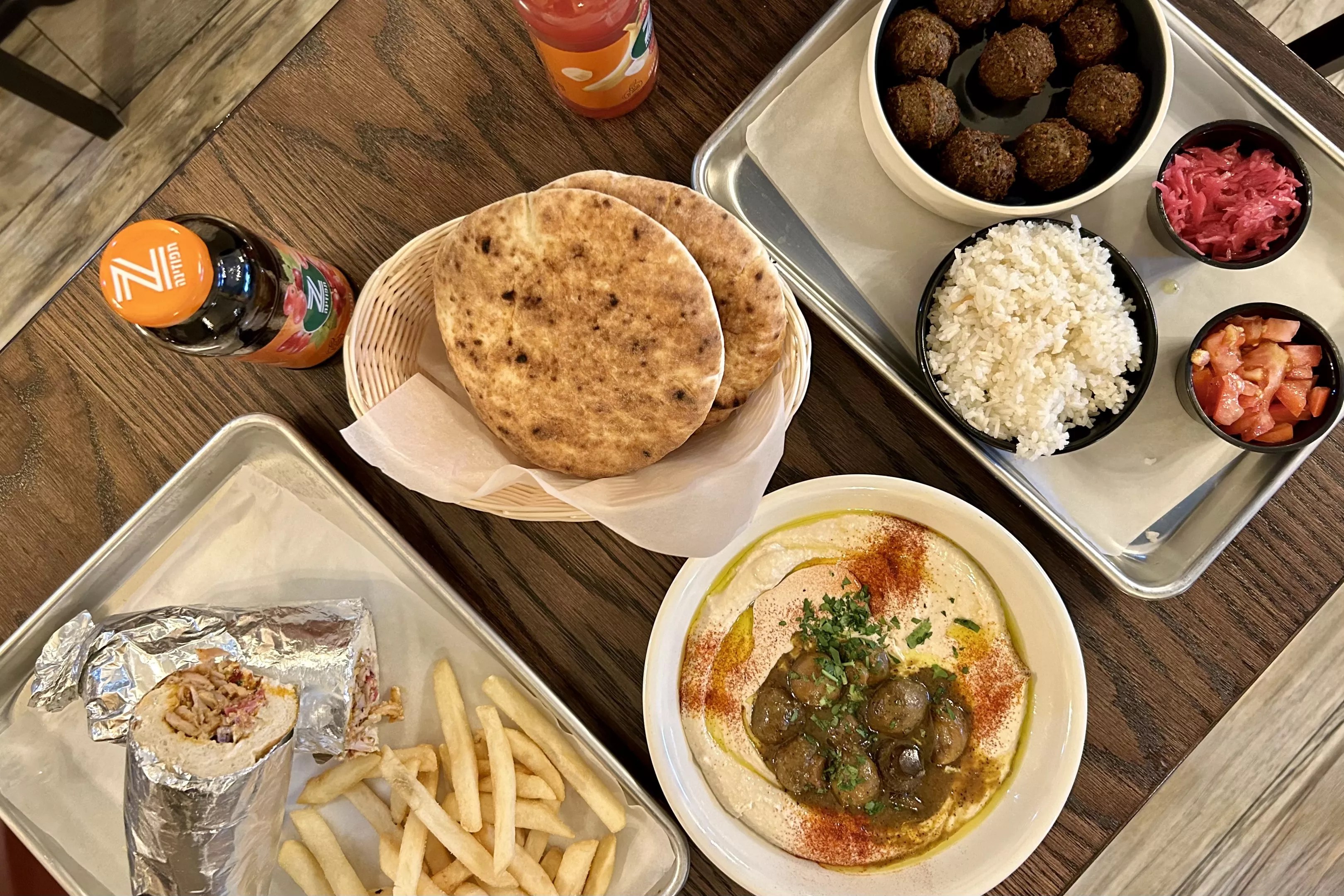 The menu lists five side options including French fries, sweet-potato fries, rice, falafel and Israeli chopped salad. There are also four flavors of hummus available: shawarma, sabich, falafel and mushroom. Drinks are featured on the overhead menu, though visitors will likely first spot colorful bottles of Prigat, an Israeli juice, stocked in a self-serve refrigerator.
