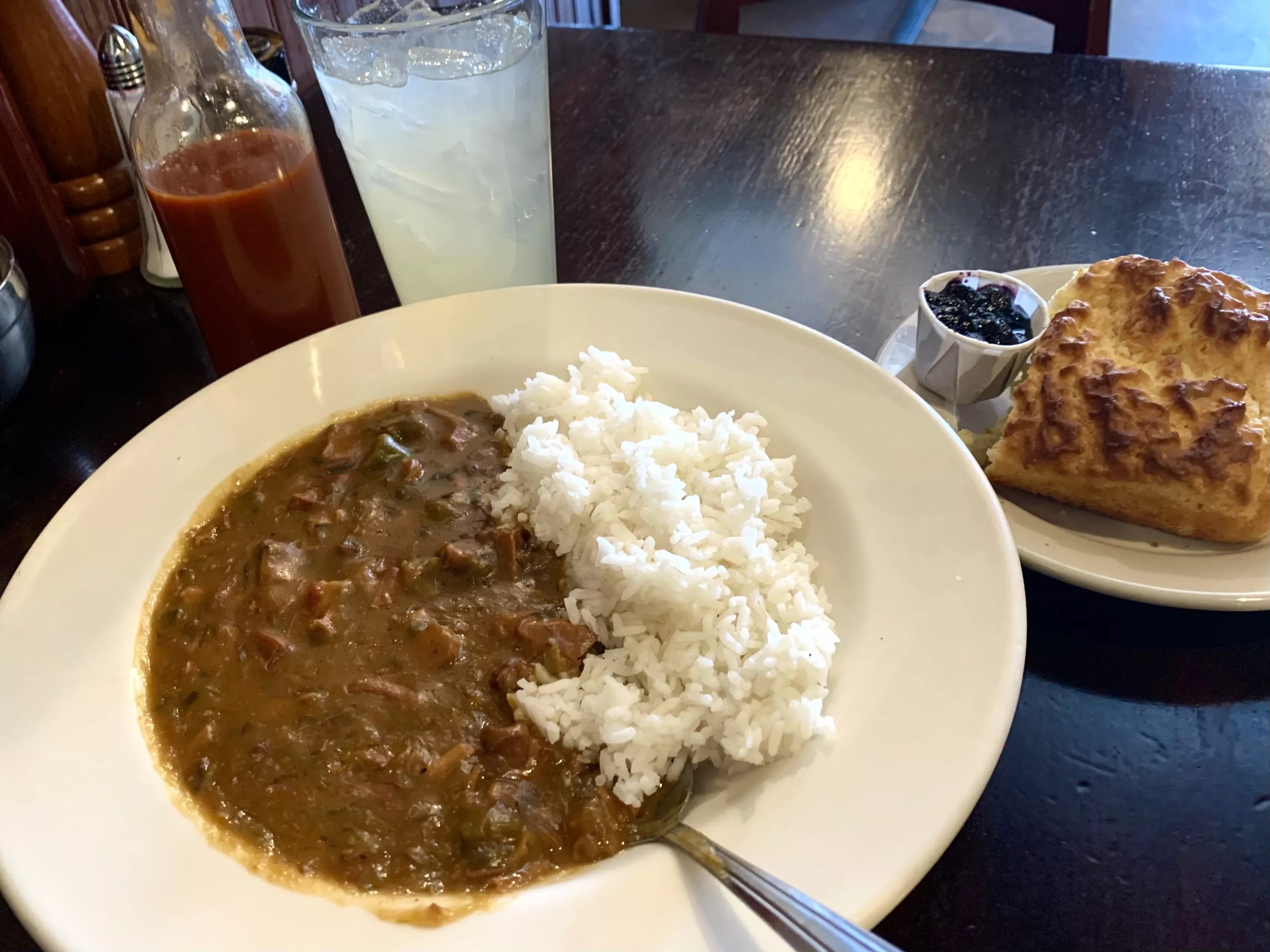 Lucile’s serves its bowl of gumbo with its famous biscuit.