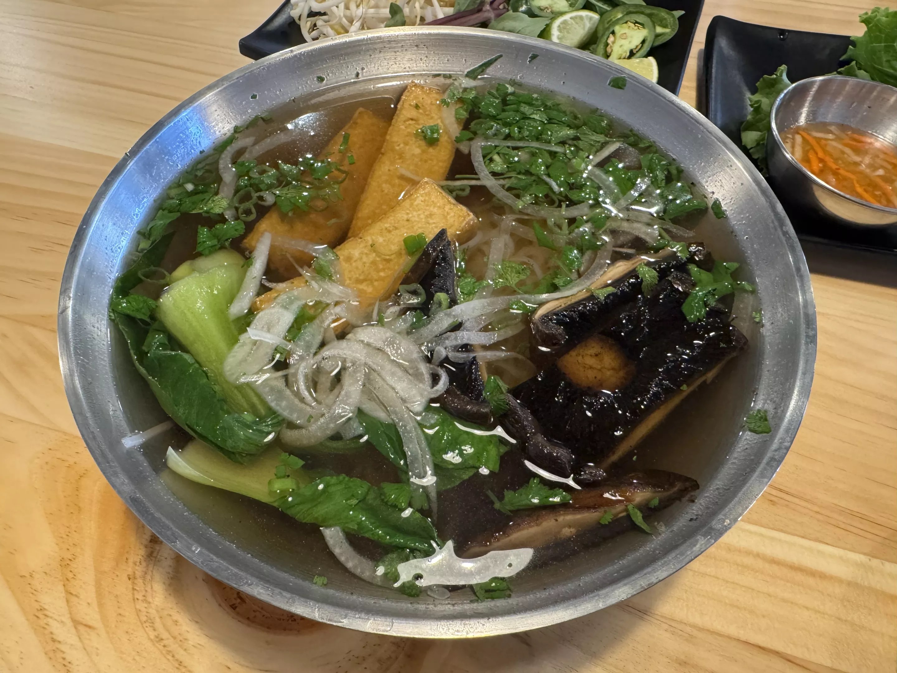 For the regular pho broth, Pham eschews seasoning packages and instead buys and roasts every spice, then simmers the bone broth for 24 hours. The result falls firmly in the pho bac camp, the “traditional and original” pho from North Vietnam. It’s known for its mild, clear broth, with aromatics such as star anise playing a more prominent role compared to that of pho nam, which is from South Vietnam and is known for its use of fish sauce, hoisin and abundant herb garnishes in the soup. Pho nam tends to be more commonplace in America.