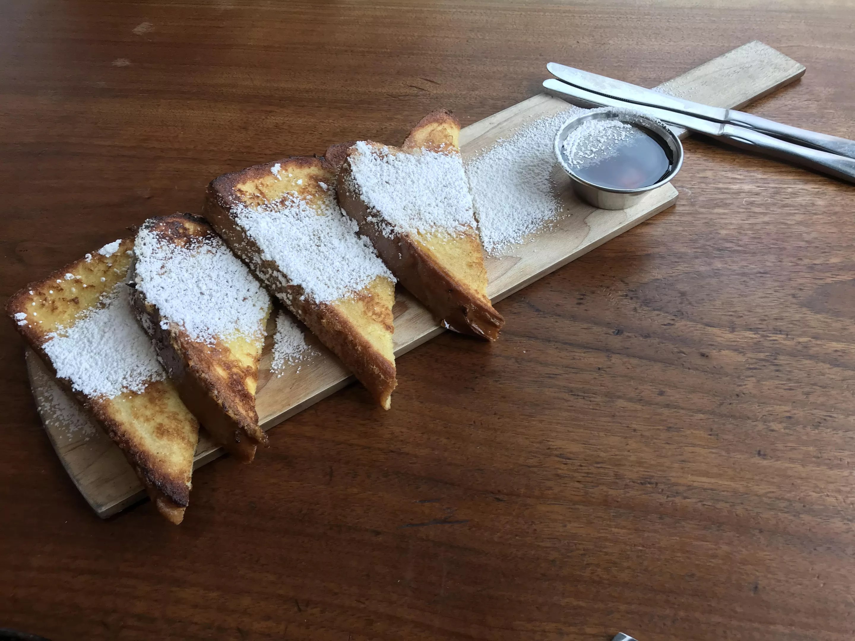 With all the entertainment, the food might seem like an afterthought, but brunch at There… matches the daring antics on the stage. I started with the “Trailer Toast” – not just because it came on a cute wooden paddle, but because the thick French toast, topped with powdered sugar and sided with maple syrup, looked tempting. Crisped to a golden brown and not too eggy, it proved as tasty as it looked.