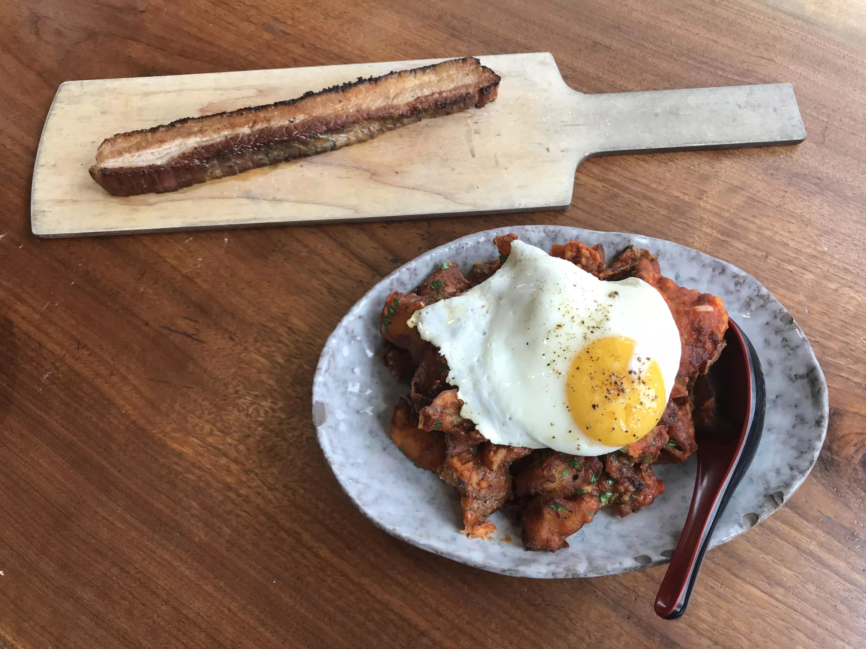 Slow-roasted pork belly arrives at the table as one of the thickest slabs of bacon I have ever seen. The pork comes from Red Top Farm and is smoky and tender, with crisp edges. A side of potatoes bravas (which There… regulars will recognize from the dinner menu), come out roasted and crunchy, topped with a tomato sauce built for garlic lovers.