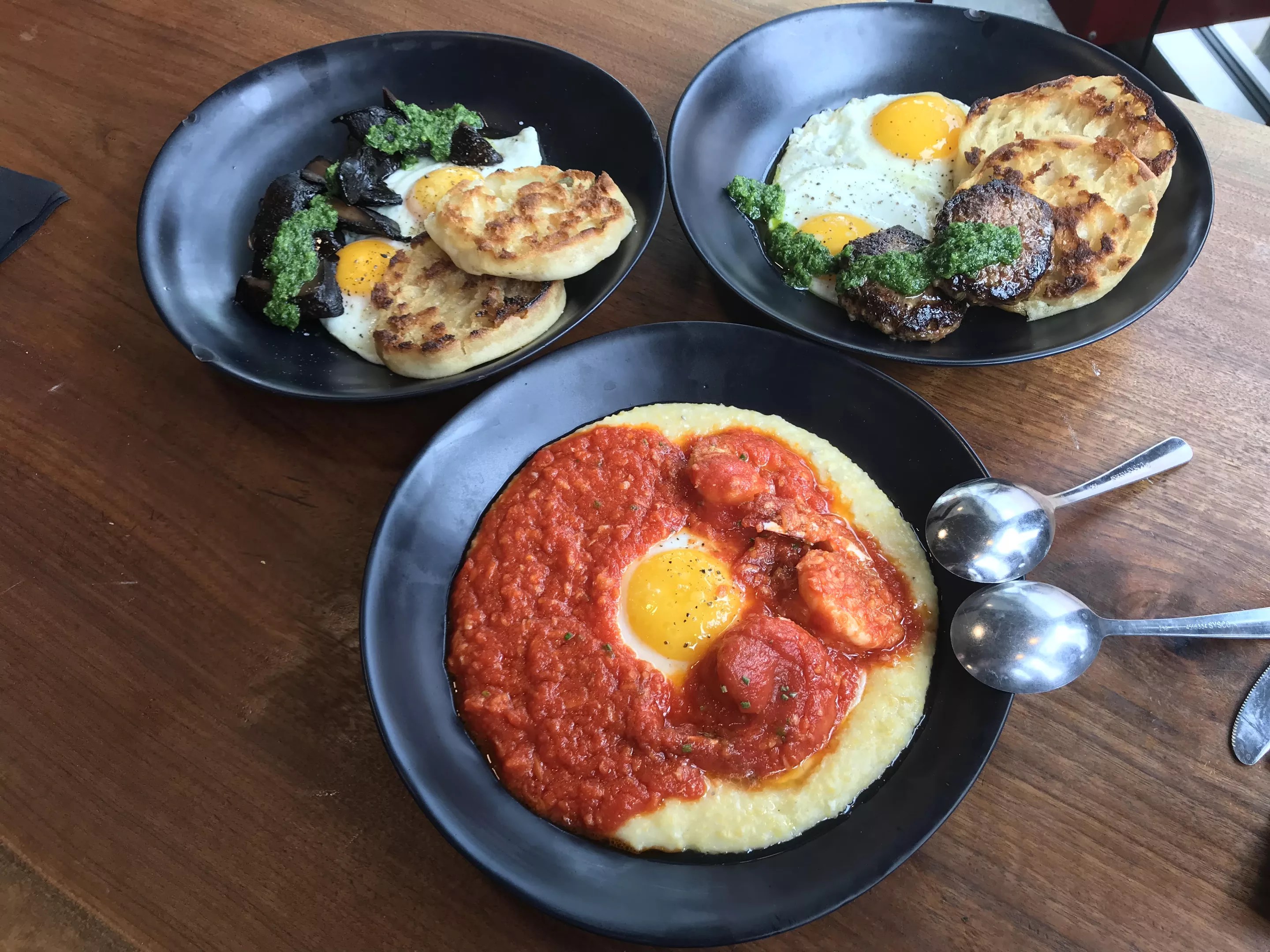Eggs, with mushrooms, merguez sausage or shrimp and polenta.