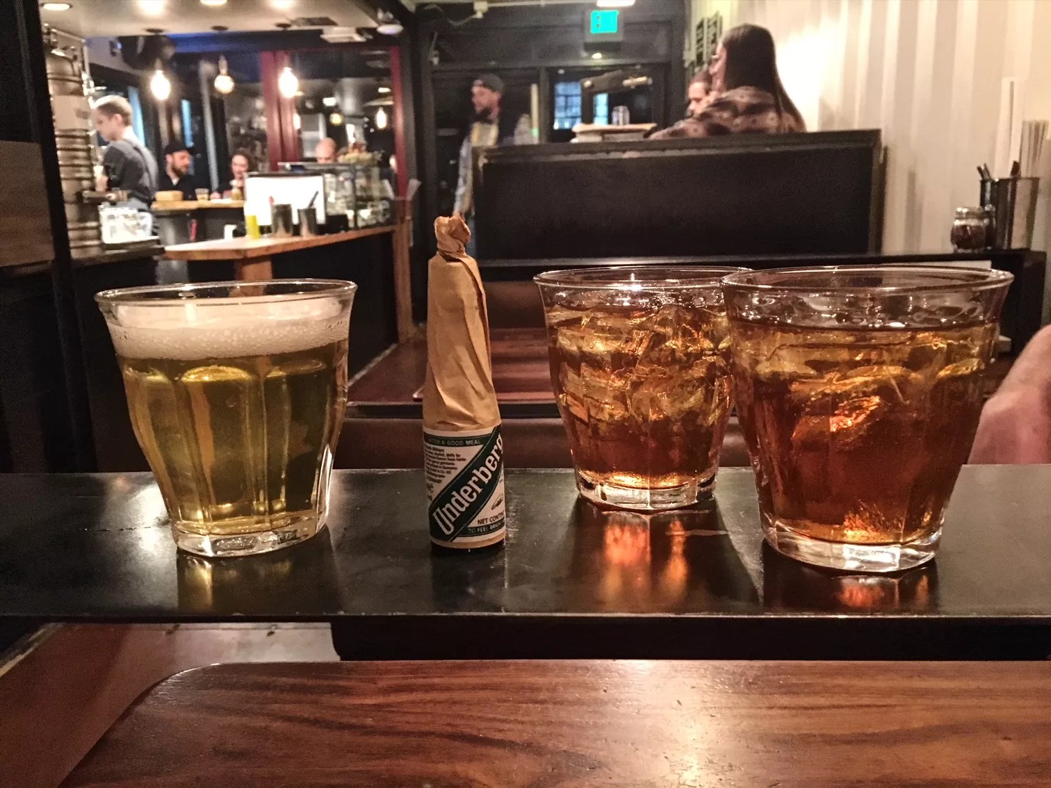 Late-night happy-hour Manhattans and a beer-and-Underberg combo.