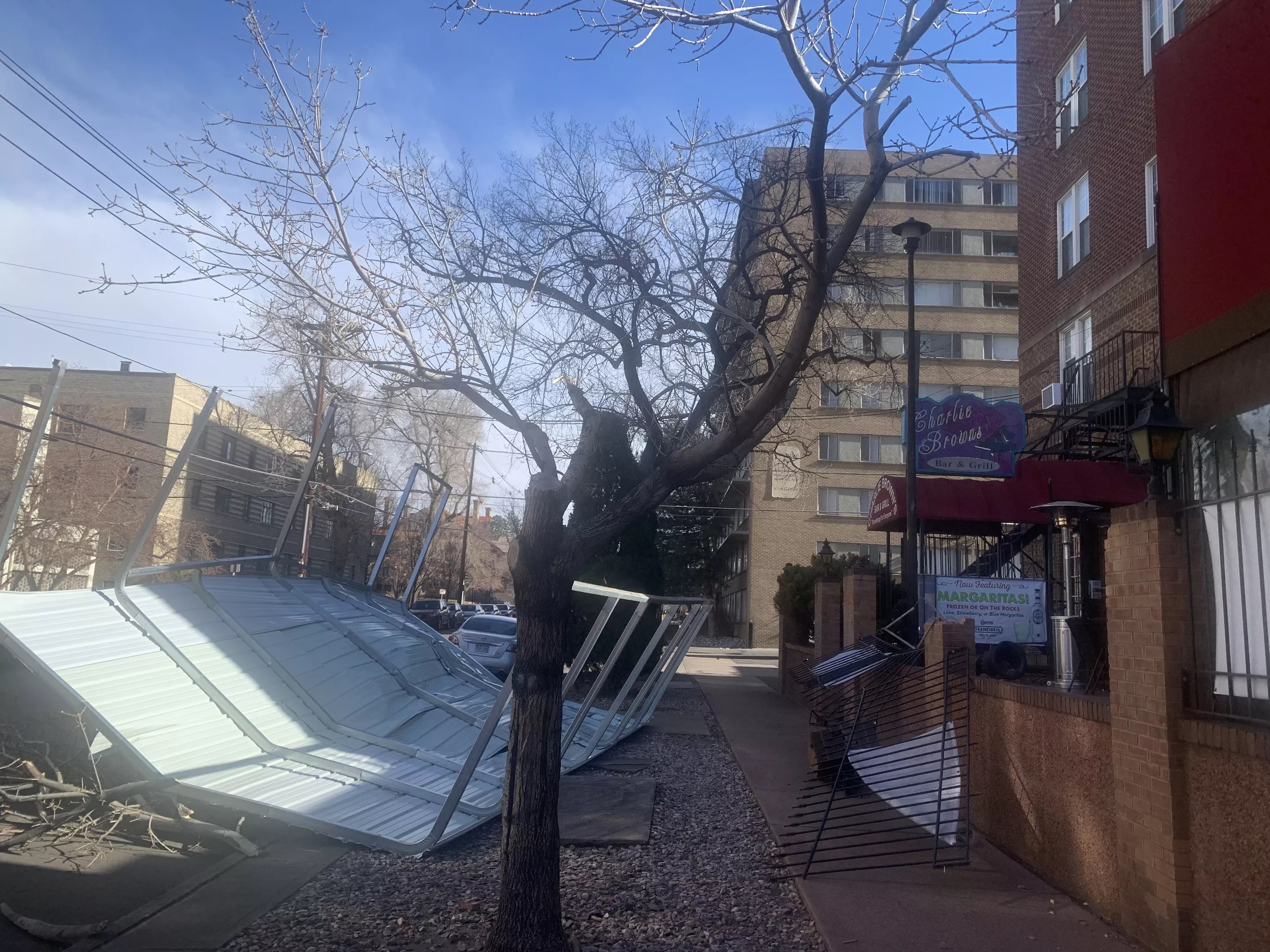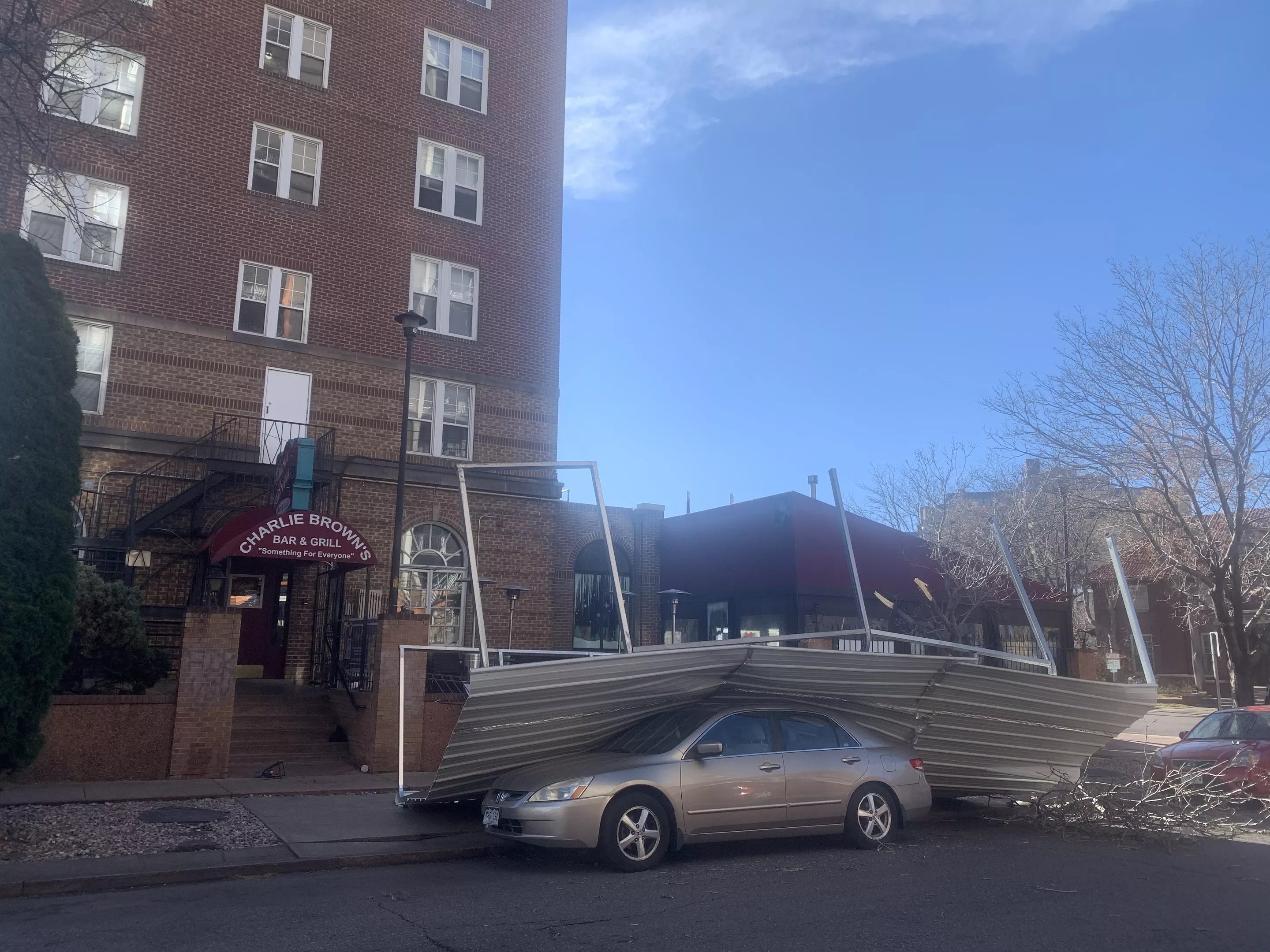 The gusty conditions are a big story today, and if you had any doubt that the forecast was for real, look no further than Charlie Brown’s, at 980 Grant Street. The temporary rooftop covering a portion of the smoking-friendly patio at this classic piano bar (one of the 100 bars we can’t live without) fell victim to the windy weather, blowing off and landing on a parked car.