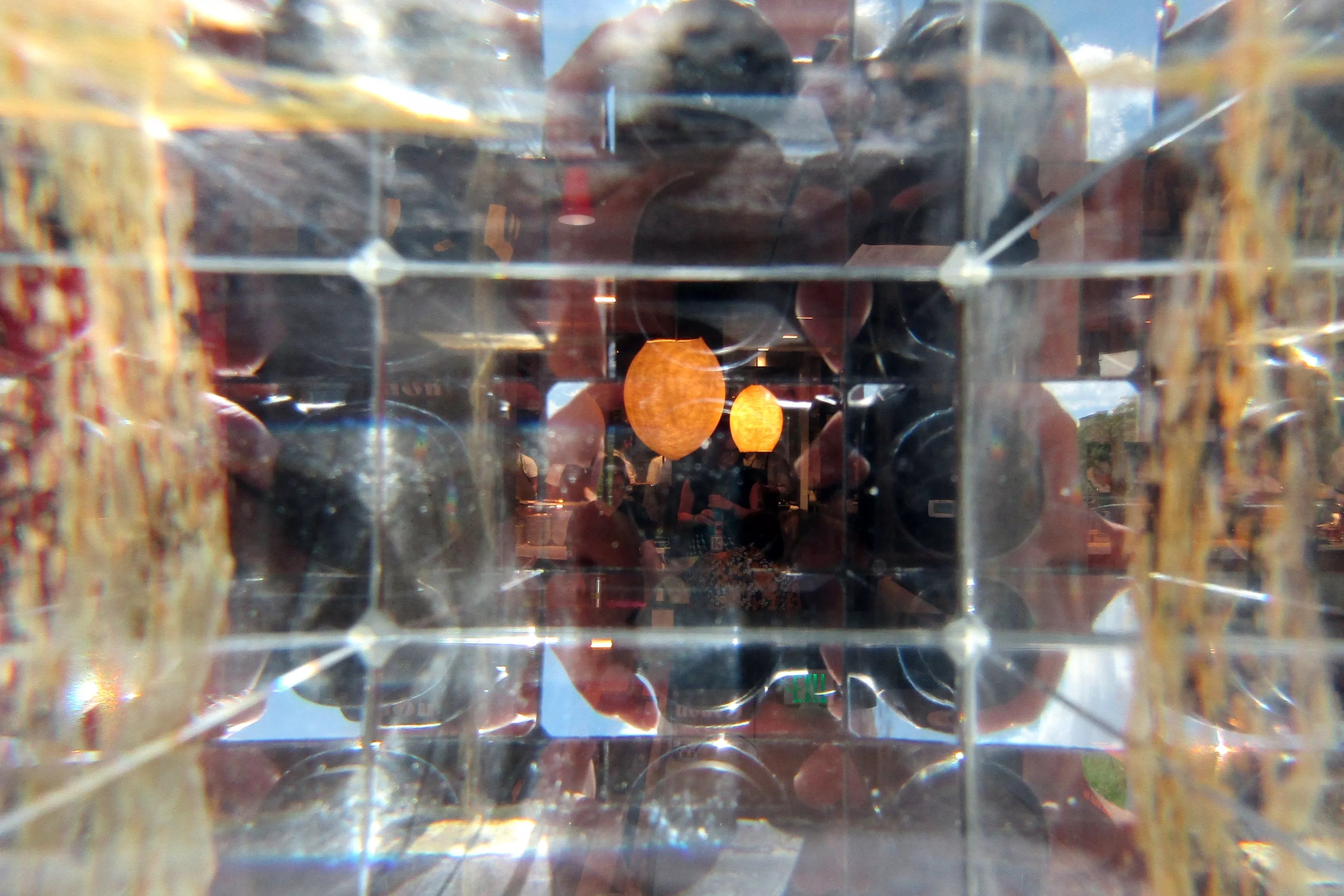 A view into Uchi’s kitchen through a prismatic glass brick in the wall facing 25th Street.