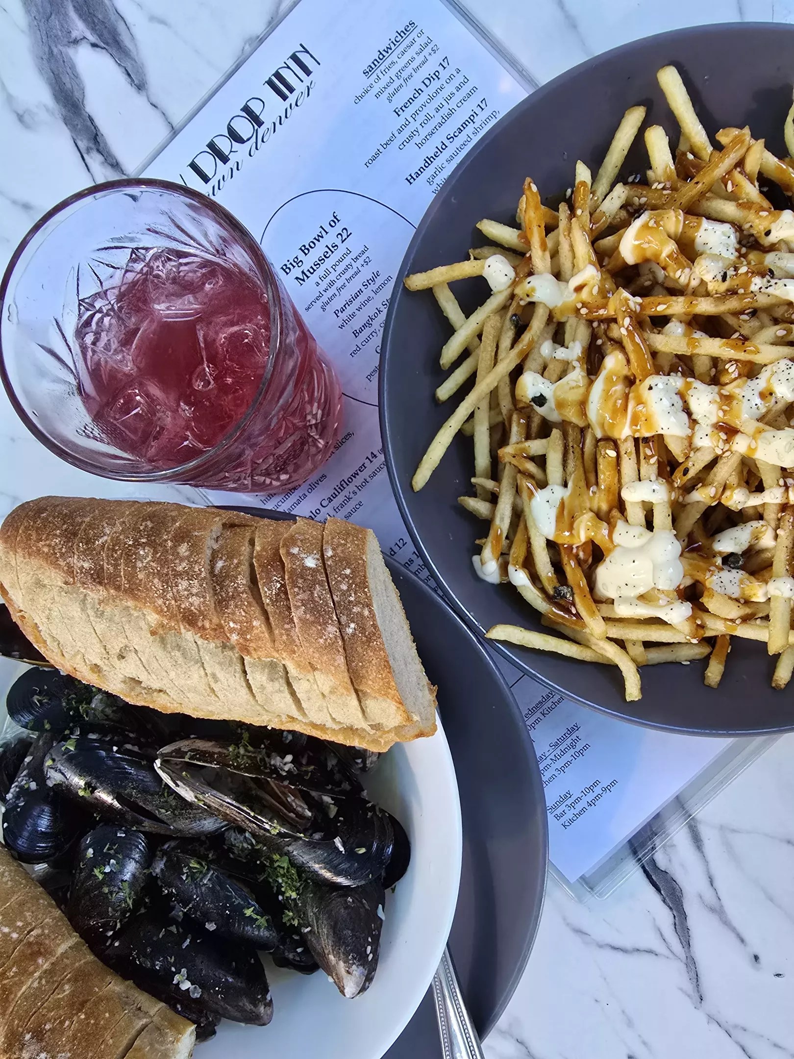 The Parisian-style mussels and Samurai Fries at Dew Drop Inn.