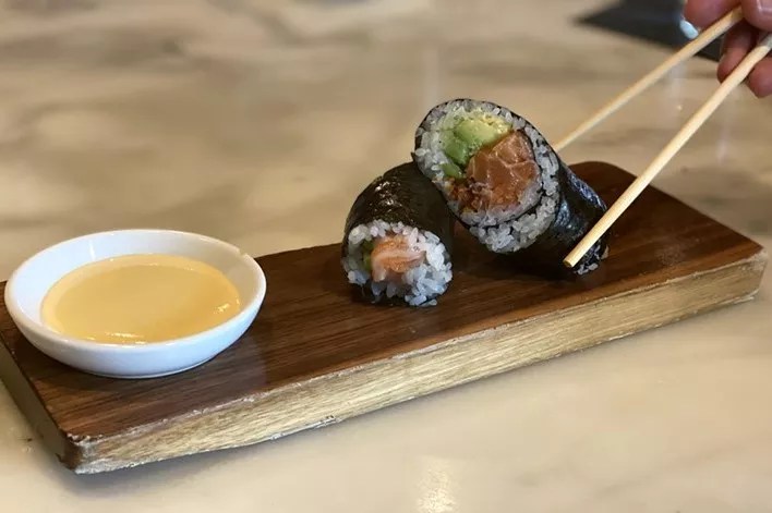 We started with a simple yet elegant bincho ($7), thin slices of tuna draped over a small mound of tacky sushi rice and finished with flaked sea salt. Next, the gai lan, chinese broccoli with pineapple Szechuan ponzu, comes perfectly al dente and even delivers on its promise of the buzzy, numbing citric highlight from Szechuan peppercorns. The “yokai berry” (a salmon roll with fried kale, Asian pear, yuzu dashi and blueberry) transforms a basic salmon roll into a fruity, silky fish experience.