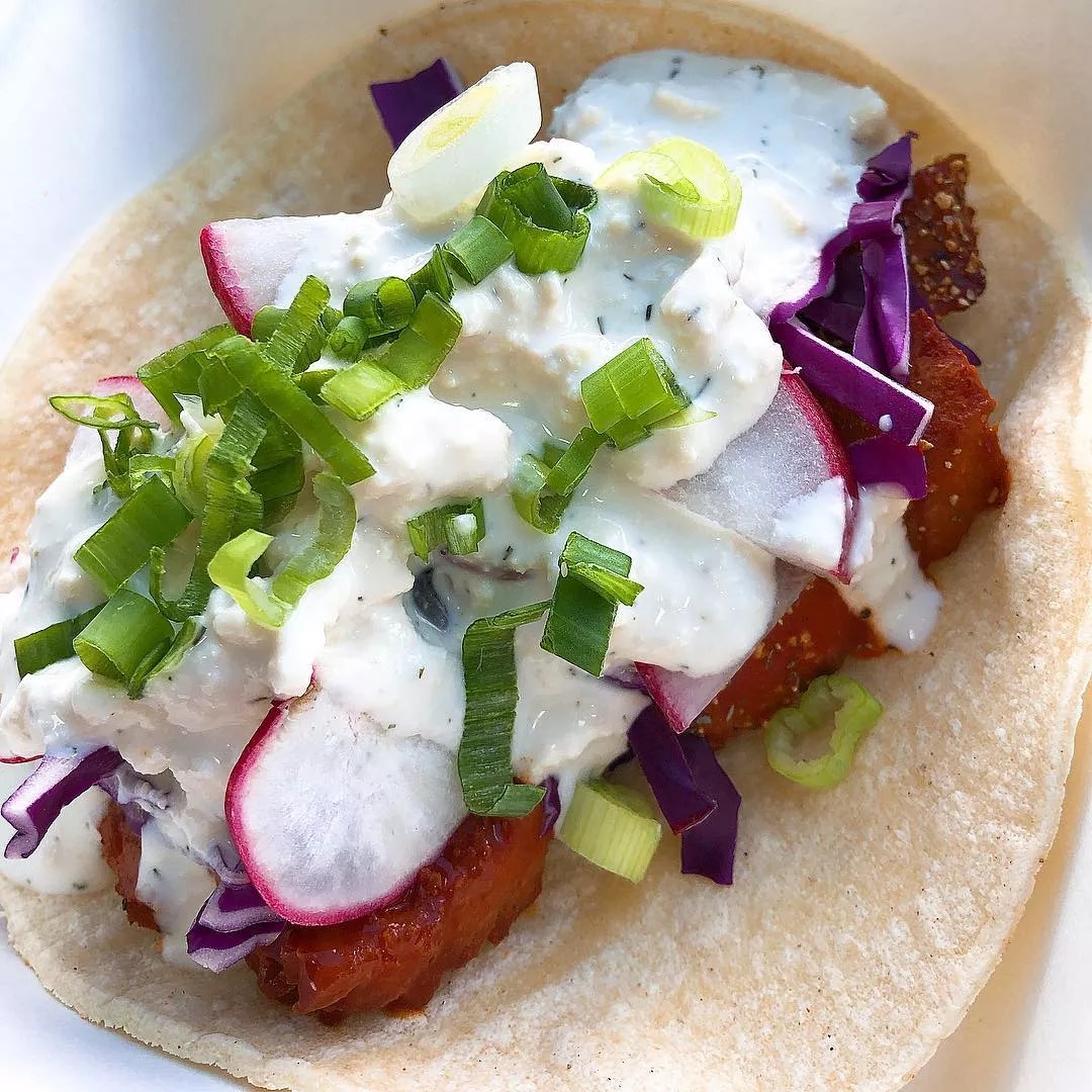 Buffalo-wing tacos from Migration are covered in a creamy, dairy-free vegan blue cheese sauce.